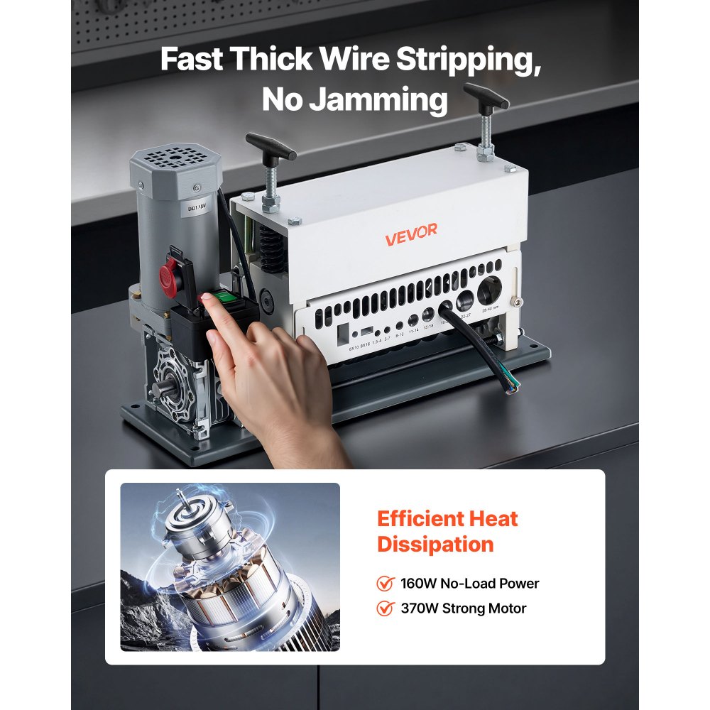 11 κανάλια τροφοδοσίας: Η ηλεκτρική μας μηχανή απογύμνωσης καλωδίων ταιριάζει σε διαμέτρους καλωδίων από 0,06 έως 1,57 ίντσες (1,5 έως 40 mm), χειριζόμενη τα πάντα, από λεπτά καλώδια έως χοντρά καλώδια. Ιδανική για οικιακή χρήση, έργα DIY, γκαράζ και μικρά εργαστήρια. Υψηλή Απόδοση: Διαθέτοντας έναν κινητήρα χαλκού 370W, αυτή η αυτόματη μηχανή απογύμνωσης καλωδίων προσφέρει εξαιρετική ισχύ και ταχύτητα, ξεπερνώντας τις χειροκίνητες μηχανές. Η είσοδος καλωδίων πολλαπλών οπών επιτρέπει την γρήγορη αλλαγή μεγέθους καλωδίων χωρίς αλλαγή εξαρτημάτων. Λεπτή απογύμνωση για λεπτά καλώδια: Σχεδιασμένο με οδηγό σωλήνα και βαθιούς κυλίνδρους αυλάκωσης V, αυτό το ηλεκτρικό μηχανοκίνητο απογυμνωτή καλωδίων διατηρεί τα λεπτά καλώδια ευθυγραμμισμένα και σταθερά, αποφεύγοντας την ολίσθηση ή τη ζημιά στους χάλκινους πυρήνες, εξασφαλίζοντας παράλληλα μια καθαρή, λεία ταινία κάθε φορά. Χειροκίνητη ή ηλεκτρική διπλή λειτουργία: Απολαύστε δύο λειτουργίες απογύμνωσης με το απογυμνωτή καλωδίων μας. Χρησιμοποιήστε το ηλεκτρικό ρεύμα για αποτελεσματική απογύμνωση μεγάλων παρτίδων ή μεταβείτε σε χειροκίνητη λειτουργία όταν είναι αποσυνδεδεμένο — ο συμπλέκτης αποσυνδέεται για ομαλή λειτουργία με το χέρι. Ανθεκτικές λεπίδες, κατασκευασμένες για να διαρκέσουν: Εξοπλισμένη με λεπίδα υψηλής αντοχής, σκληρυμένη κατά HRC50, αυτή η ηλεκτρική μηχανή απογύμνωσης καλωδίων προσφέρει κοφτερή, ανθεκτική απόδοση κοπής. Η λεπίδα είναι ανθεκτική στη φθορά και διατηρεί την ακρίβεια ακόμα και μετά από μακροχρόνια χρήση.