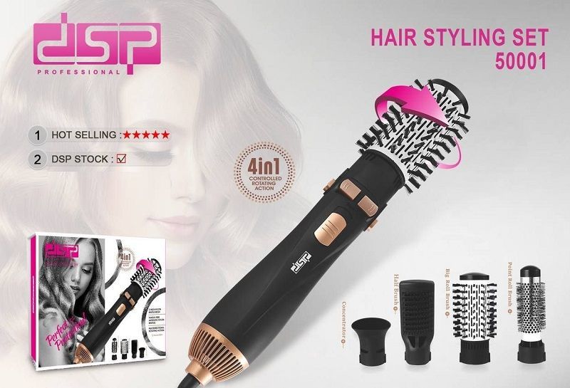Ηλεκτρική βούρτσα μαλλιών της DSP 4 σε 1, που στεγνώνει, χτενίζει, φορμάρει και ισιώνει τα μαλλιά σας σε ελάχιστο χρόνο με τη δύναμη του αέρα, προστατεύοντάς τα παράλληλα από τη φθορά της θερμότητας, αφήνοντας ένα λείο, λαμπερό αποτέλεσμα.