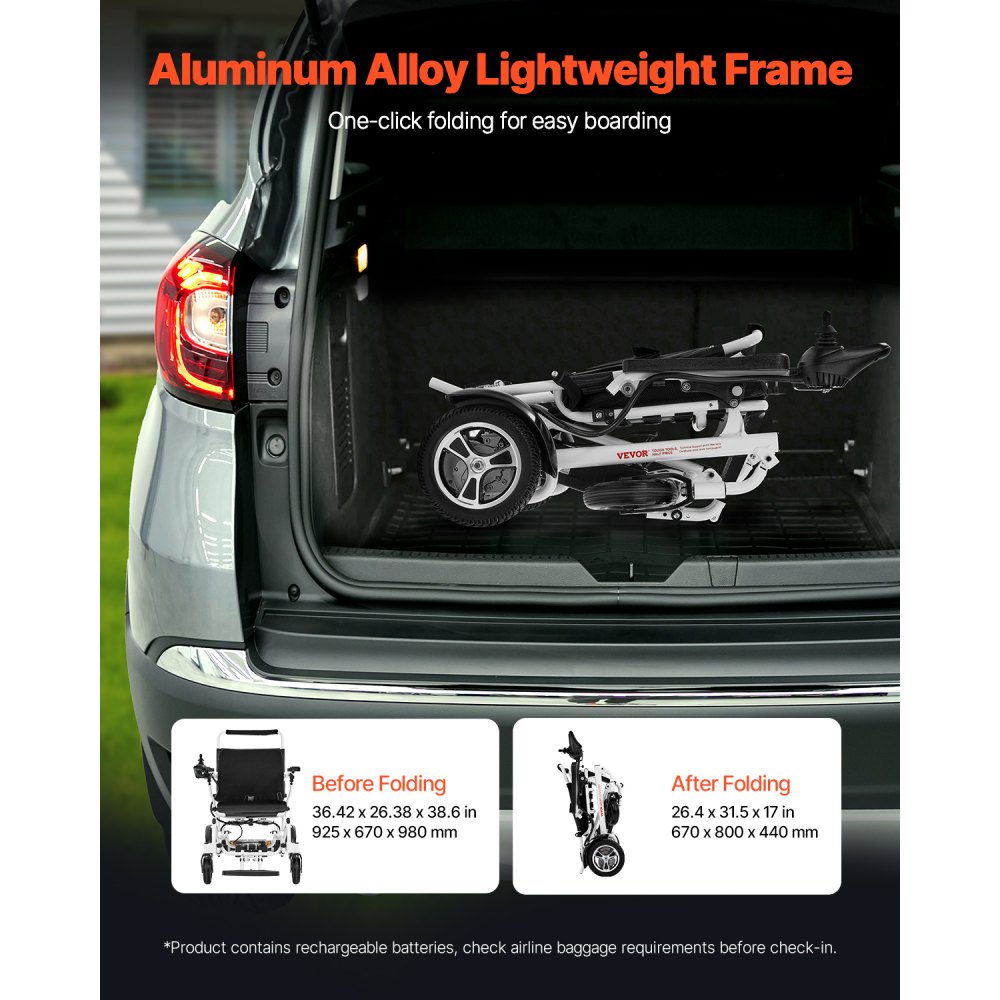 Ρύθμιση 5 ταχυτήτων: Ελέγξτε εύκολα την ταχύτητά σας με το ένα χέρι. Το joystick είναι αναστρέψιμο και διαθέτει ρύθμιση 5 ταχυτήτων, ένδειξη μπαταρίας, διακόπτη λειτουργίας, κουμπί κόρνας και ένδειξη ταχύτητας, προσφέροντας απόλυτη άνεση. Εμβέλεια 13 μιλίων: Αυτό το φορητό ηλεκτρικό αναπηρικό αμαξίδιο προσφέρει εμβέλεια 13 μιλίων με μια πλήρη φόρτιση. Με μόλις 8-10 ώρες φόρτισης, η αποσπώμενη μπαταρία σας εξασφαλίζει ότι είστε έτοιμοι για καθημερινές επισκέψεις στο νοσοκομείο ή το σούπερ μάρκετ. Μέγιστη ταχύτητα 6 χλμ./ώρα (3,7 μίλια/ώρα) Αναδίπλωση με ένα κουμπί: Αναδιπλώστε εύκολα το ηλεκτρικό πτυσσόμενο αναπηρικό αμαξίδιο χρησιμοποιώντας το σύστημα ενός κουμπιού. Συμπαγές και ελαφρύ, είναι ιδανικό για ταξίδια, καθιστώντας εύκολη τη μεταφορά και την αποθήκευση για ταξίδια σε νοσοκομεία, αεροδρόμια και άλλα. Ελαστικά 11 ιντσών: Εξοπλισμένο με ελαστικά 10 ιντσών, ανθεκτικά στα τρυπήματα, αυτό το ηλεκτρικό αναπηρικό αμαξίδιο προσφέρει εξαιρετική σταθερότητα και ανθεκτικότητα. Με δυνατότητα ανάβασης σε κλίσεις 6° ή 9°, το βαθύ σχέδιο πέλματος ενισχύει την πρόσφυση. Ικανότητα βάρους 300 λιβρών: Υποστηρίζει βάρος έως 300 λίβρες (136 κιλά) με ένα ευρύχωρο κάθισμα 21 ιντσών (533,4 χιλ.) για άνεση και σταθερότητα. Το στιβαρό μεταλλικό πλαίσιο εξασφαλίζει μακροχρόνια ανθεκτικότητα, καθιστώντας αυτό το ηλεκτρικό αναπηρικό αμαξίδιο ιδανικό για καθημερινή χρήση.