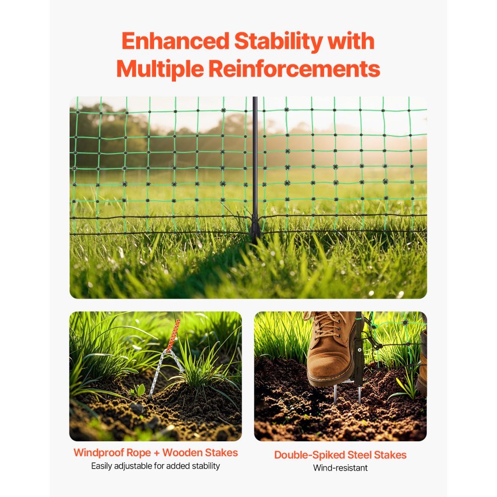 Ολοκληρωμένος σχεδιασμός μεγέθους: Το ηλεκτρικό δίχτυ περίφραξης έχει διαστάσεις 50 ίντσες x 164 πόδια/1,27 x 49,98 μ., με επιστημονικά τοποθετημένα πλέγματα και πασσάλους με διπλά καρφιά, εξασφαλίζοντας ένα ασφαλές και σταθερό περίβλημα για ζώα όλων των μεγεθών. Ανθεκτικό και Στιβαρό: Κατασκευασμένο για να αντέχει στα στοιχεία της φύσης, αυτό το ηλεκτρικό δίχτυ περιλαμβάνει αντιανεμικά κιτ και στύλους από υαλοβάμβακα για μακροχρόνια αντοχή. Μια προειδοποιητική πινακίδα και ένα κιτ επισκευής απλοποιούν τη συντήρηση, διατηρώντας τον φράχτη σας σε άριστη κατάσταση. Ευρεία εφαρμογή: Αυτός ο ηλεκτρικός φράχτης με δίχτυ είναι ιδανικός για πρόβατα, ελάφια, χοίρους, σκύλους και άλλα μεγάλα ζώα, παρέχοντας αξιόπιστη προστασία για το αγρόκτημα ή το βοσκότοπό σας. Αποτελεσματικό ηλεκτρικό ρεύμα: Σχεδιασμένο για να ρυθμίζει την ένταση του ηλεκτρικού ρεύματος, αυτό το ηλεκτρικό δίχτυ για ζώα προσφέρει αποτελεσματική προστασία χωρίς να προκαλεί βλάβη στα ζώα, εξασφαλίζοντας την ασφάλεια για τα πουλερικά και τα ζώα. Πολλαπλές επιλογές τροφοδοσίας: Συμβατό με AC110-240V, ηλιακούς συλλέκτες και πηγές τροφοδοσίας DC (δεν περιλαμβάνονται), αυτό το ηλεκτρικό φράχτη προσφέρει οικολογικές και αποδοτικές επιλογές ενέργειας για το αγρόκτημά σας.