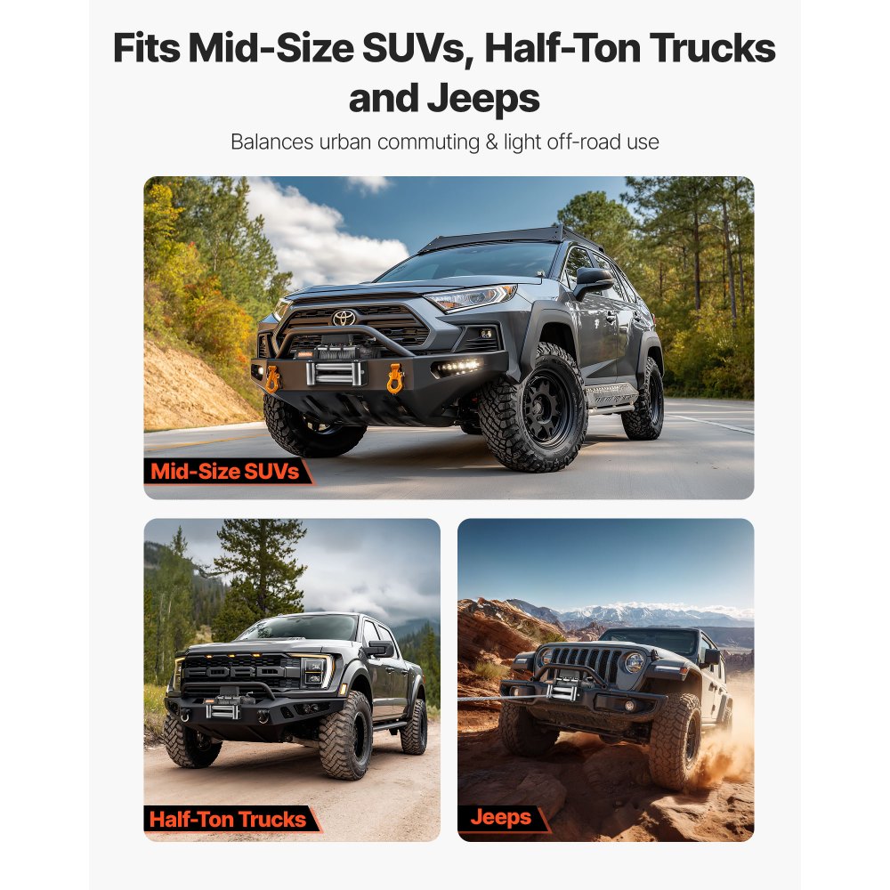 Ισχυρή έλξη 10.000 λίβρες: Αυτό το ηλεκτρικό βαρούλκο προσφέρει δύναμη έλξης 10.000 λίβρες, κάνοντας την ανάκτηση SUV ή pickup από λάσπη ή άμμο γρήγορη και χωρίς άγχος χωρίς ανησυχίες για παραμόρφωση του γραναζιού. Υψηλής Ισχύος Διάσωσης: Αυτός ο κινητήρας 3HP του βαρούλκου τζιπ με πλανητικό γρανάζι 3 σταδίων 265:1 προσφέρει σταθερή δύναμη έλξης. Λειτουργεί για πολλές ώρες χωρίς υπερθέρμανση, προσφέροντάς σας αξιόπιστη δύναμη για ανάκαμψη εκτός δρόμου. Ανθεκτικό σε όλες τις καιρικές συνθήκες: Το χαλύβδινο σχοινί 19 κλώνων 21/64 ίντσες x 65 πόδια είναι ανθεκτικό στο ηλιακό φως, τη φθορά και το σπάσιμο. Με σώμα από κράμα με στεγανοποίηση IP55, το βαρούλκο του φορτηγού παραμένει ανθεκτικό στη σκόνη, τη βροχή και το σκληρό έδαφος. Ασφαλές τηλεχειριστήριο: Το ασύρματο τηλεχειριστήριο 59 ποδιών του βαρούλκου σάς επιτρέπει να διατηρείτε ασφαλή απόσταση κατά τη λειτουργία. Ένα ενσύρματο τηλεχειριστήριο 9,8 ποδιών περιλαμβάνεται ως εφεδρικό, ιδανικό για ορεινά μονοπάτια ή περιοχές με αδύναμο σήμα. Ευρεία συμβατότητα: Το καθολικό σχέδιο τοποθέτησης ταιριάζει στα περισσότερα SUV, pickup και τζιπ. Το σετ βαρούλκου ανάκτησης περιλαμβάνει καλώδιο fairlead, γάντζο και καλώδια τροφοδοσίας—έτοιμα για γρήγορη εγκατάσταση και χρήση.