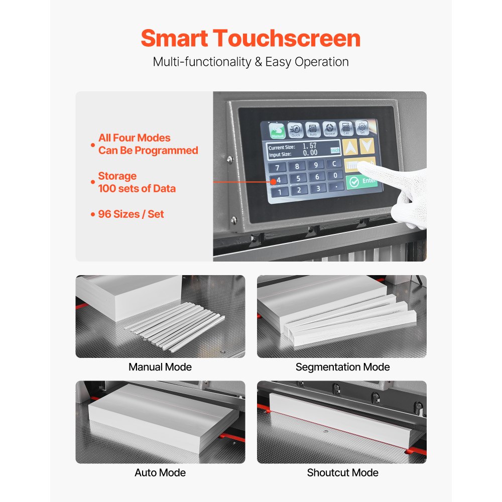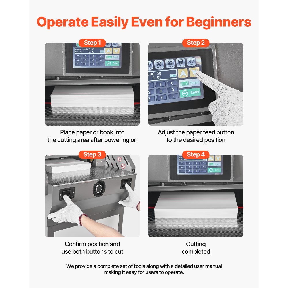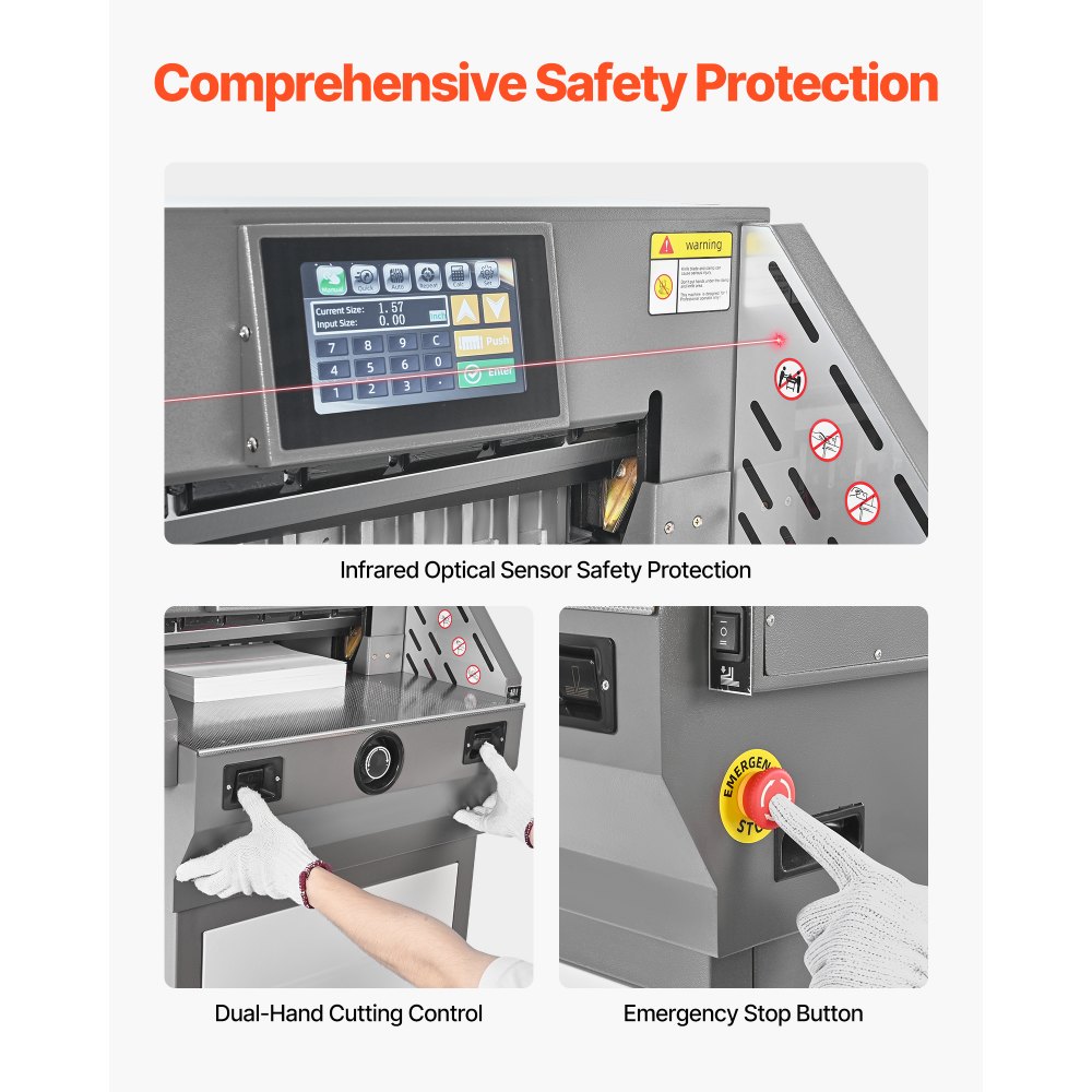 Κοπή μεγάλου και χοντρού χαρτιού με ένα πέρασμα: Ο ηλεκτρικός κόφτης χαρτιού κόβει έως και 457 mm πλάτος και 58 mm πάχος με ένα πέρασμα. Μπορεί να χειριστεί αποτελεσματικά στοίβες χαρτιού, βιβλία και χαρτόνια, εξοικονομώντας χρόνο και εργασία. Λεπίδα υψηλής σκληρότητας: Κατασκευασμένη από υψηλής ποιότητας χάλυβα εργαλείων υψηλής ταχύτητας, αυτή η ηλεκτρική μηχανή κοπής χαρτιού διαρκεί 50% περισσότερο από τις τυπικές λεπίδες και κόβει καθαρά χαρτί φωτοτυπίας ή χαρτόνι. Κοπή ακριβείας: Η ακρίβεια του κοπτικού χαρτιού μας εξασφαλίζει ομαλές και ομοιόμορφες άκρες. Ιδανικό για πιστοποιητικά, μενού, φυλλάδια και άλμπουμ όπου το επαγγελματικό φινίρισμα έχει σημασία. Σχεδιασμός Ολοκληρωμένης Ασφάλειας: Αυτή η μηχανή κοπής χαρτιού είναι εξοπλισμένη με αισθητήρες υπερύθρων, διπλό χειριστήριο και κουμπί διακοπής έκτακτης ανάγκης. Τα χαρακτηριστικά ασφαλείας πολλαπλών επιπέδων μειώνουν τους κινδύνους κατά την κοπή βαρέως τύπου. Εύκολο στη χρήση: Απλώς τοποθετήστε το χαρτί, ρυθμίστε το κουμπί ώθησης, επιβεβαιώστε τη θέση και πατήστε τα διπλά πλήκτρα. Εξοπλισμένο με πλήρη εργαλεία και ένα λεπτομερές εγχειρίδιο, ακόμη και οι αρχάριοι μπορούν να κόβουν με ασφάλεια και αποτελεσματικότητα.