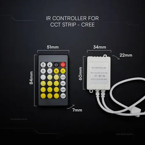 Λειτουργεί με DC 12V ή 24V, καθιστώντας τον ιδανικό για τις περισσότερες ταινίες LED CCT της αγοράς. Η σύνδεση είναι απλή και πρακτική, χωρίς ανάγκη ειδικών εργαλείων. Το τηλεχειριστήριο διαθέτει εμβέλεια έως 8 μέτρα, εξασφαλίζοντας άνετο χειρισμό από απόσταση.