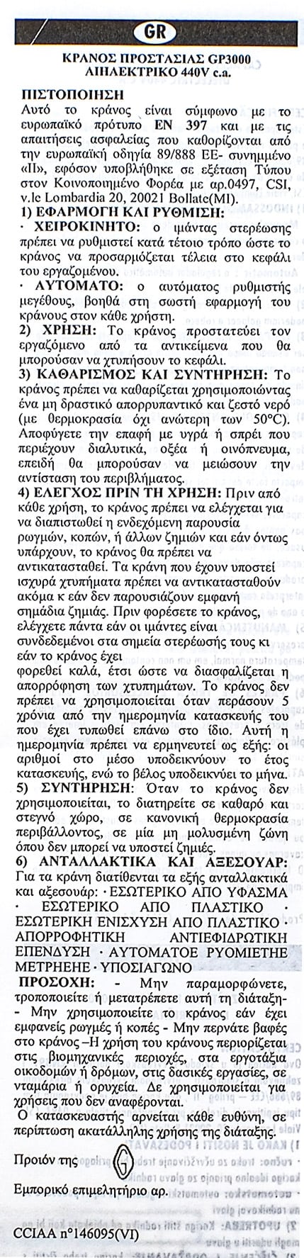 Κράνος Εργασίας Πολυαιθυλενίου ιταλικής κατασκευής GP3000. Στιβαρή κατασκευή, παρέχει την μέγιστη δυνατή ασφάλεια σε κάθε είδους εργοτάξιο. Με ρυθμιζόμενο ιμάντα για άνετη εφαρμογή σε κάθε τύπο κεφαλιού. Αντιεφιδρωτική απορροφητική επένδυση. Παρέχει προστασία από κρούση αλλά και από ρεύμα μέχρι 440V. Πιστοποιημένο σύμφωνα με τα ευρωπαϊκά πρότυπα EN 397. Χαρακτηριστικά: Υλικό: Πολυαιθυλένιο, Πλαστικό, Ύφασμα Ηλεκτρική ανοχή: 440V Θερμική ανοχή: +50 έως -20 C° Πιστοποιητικά: CE, GP3000, ΕΝ 397 Μέγεθος: 53-62cm DOA 14 Ημερών μοτρν, motrn, motren