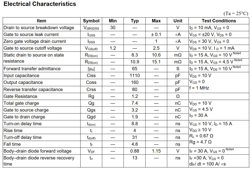 RJK03B9DPA, K03B9 Features •High speed switching •Capable of 4.5 V gate drive •Low drive current •High density mounting •Low on-resistance RDS(on) = 8.3 mΩ typ. (at VGS = 10 V) •Pb-free •Halogen-free Absolute Maximum Ratings Drain to source voltage 30V Gate to source voltage ±20V Drain current 30A Drain peak current 120A Body-drain diode reverse drain current 30A Avalanche current 8A Avalanche energy 6.4mJ Channel dissipation 25W Channel to case thermal impedance 5°C/W Channel temperature 150°C Storage temperature –55 to +150°C