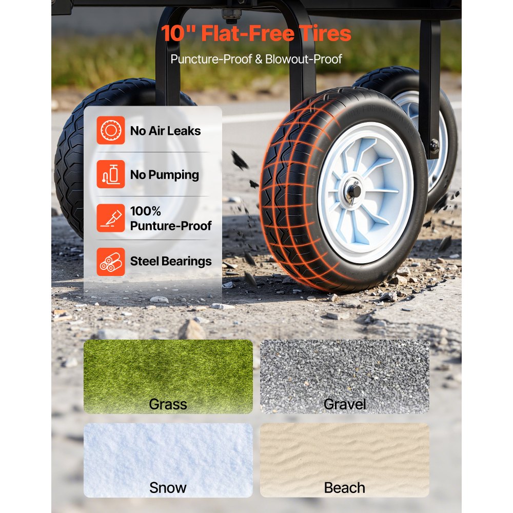 Καρότσι κήπου 2 σε 1 με κάθισμα: Λειτουργεί τόσο ως καρότσι μεταφοράς όσο και ως κάθισμα κήπου. Η πλαστική επένδυση επιτρέπει την εύκολη μεταφορά χώματος και χαλαρών υλικών, ενώ το αποσπώμενο κάθισμα λειτουργεί και ως σκαμπό κήπου. Ο πτυσσόμενος δίσκος χωράει τηλέφωνα, ποτά και εργαλεία. Ικανότητα φορτίου 500 λίβρες: Κατασκευασμένο για εύκολη μεταφορά βαρέων αντικειμένων, αυτό το καρότσι κήπου είναι ιδανικό για χώμα, πέτρες και εργαλεία. Μια ενισχυμένη εγκάρσια δοκός μεταξύ των τροχών βελτιώνει τη σταθερότητα και την αντοχή. Σημείωση: Για μεγαλύτερη διάρκεια ζωής, δεν συνιστάται η παρατεταμένη υπερφόρτωση. Ελαστικά πολυουρεθάνης 10" χωρίς σκάσιμο: Αυτό το καρότσι κήπου διαθέτει ελαστικά πολυουρεθάνης 10 ιντσών χωρίς σκάσιμο, ανθεκτικά σε τρυπήματα και δεν απαιτούν αέρα. Με εξαιρετική απορρόφηση κραδασμών, κυλάει ομαλά πάνω σε γρασίδι, χαλίκι, λάσπη και ανώμαλο έδαφος, προστατεύοντας το φορτίο σας κατά τη μεταφορά. Πολλαπλές Λειτουργίες Χρήσης: Σχεδιασμένο για ευελιξία, αυτό το καρότσι κήπου με ρόδες μετατρέπεται εύκολα από καρότσι με περίφραξη σε καρότσι με επίπεδη επιφάνεια. Τα αποσπώμενα πλαϊνά πάνελ σάς επιτρέπουν να μεταφέρετε εύκολα μεγάλα αντικείμενα, μετατρέποντάς το σε ρυμουλκούμενο με επίπεδη επιφάνεια όταν χρειάζεται. Άνετη λαβή: Το καρότσι αυλής περιλαμβάνει ρυθμιζόμενη λαβή πολλαπλών γωνιών για ομαλό σύστημα διεύθυνσης και εξαιρετική ευελιξία. Οδηγήστε εύκολα το καρότσι προς οποιαδήποτε κατεύθυνση και απολαύστε μια άνετη εμπειρία μεταφοράς κατά τη διάρκεια απαιτητικών εργασιών μεταφοράς.