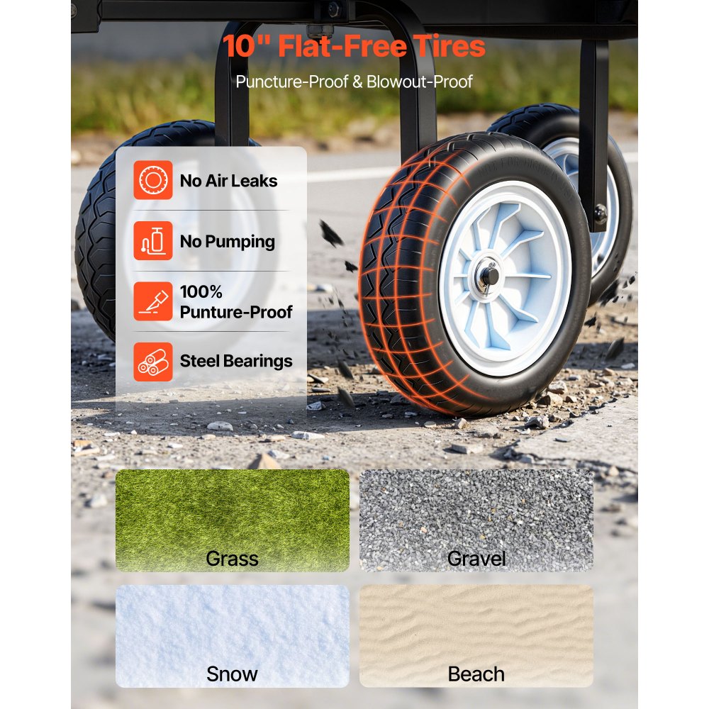 Καρότσι κήπου 2 σε 1 με κάθισμα: Λειτουργεί τόσο ως καρότσι μεταφοράς όσο και ως κάθισμα κήπου. Η πλαστική επένδυση επιτρέπει την εύκολη μεταφορά χώματος και χαλαρών υλικών, ενώ το αποσπώμενο κάθισμα λειτουργεί και ως σκαμπό κήπου. Ο πτυσσόμενος δίσκος χωράει τηλέφωνα, ποτά και εργαλεία. Ικανότητα φορτίου 500 λίβρες: Κατασκευασμένο για εύκολη μεταφορά βαρέων αντικειμένων, αυτό το καρότσι κήπου είναι ιδανικό για χώμα, πέτρες και εργαλεία. Μια ενισχυμένη εγκάρσια δοκός μεταξύ των τροχών βελτιώνει τη σταθερότητα και την αντοχή. Σημείωση: Για μεγαλύτερη διάρκεια ζωής, δεν συνιστάται η παρατεταμένη υπερφόρτωση. Ελαστικά πολυουρεθάνης 10" χωρίς σκάσιμο: Αυτό το καρότσι κήπου διαθέτει ελαστικά πολυουρεθάνης 10 ιντσών χωρίς σκάσιμο, ανθεκτικά σε τρυπήματα και δεν απαιτούν αέρα. Με εξαιρετική απορρόφηση κραδασμών, κυλάει ομαλά πάνω σε γρασίδι, χαλίκι, λάσπη και ανώμαλο έδαφος, προστατεύοντας το φορτίο σας κατά τη μεταφορά. Πολλαπλές Λειτουργίες Χρήσης: Σχεδιασμένο για ευελιξία, αυτό το καρότσι κήπου με ρόδες μετατρέπεται εύκολα από καρότσι με περίφραξη σε καρότσι με επίπεδη επιφάνεια. Τα αποσπώμενα πλαϊνά πάνελ σάς επιτρέπουν να μεταφέρετε εύκολα μεγάλα αντικείμενα, μετατρέποντάς το σε ρυμουλκούμενο με επίπεδη επιφάνεια όταν χρειάζεται. Άνετη λαβή: Το καρότσι αυλής περιλαμβάνει ρυθμιζόμενη λαβή πολλαπλών γωνιών για ομαλό σύστημα διεύθυνσης και εξαιρετική ευελιξία. Οδηγήστε εύκολα το καρότσι προς οποιαδήποτε κατεύθυνση και απολαύστε μια άνετη εμπειρία μεταφοράς κατά τη διάρκεια απαιτητικών εργασιών μεταφοράς.