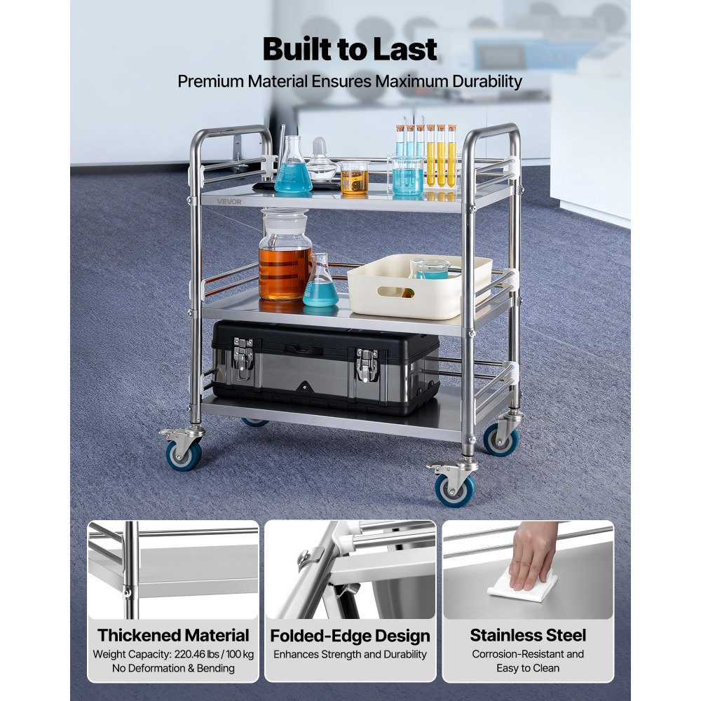 Ανοξείδωτο ατσάλι: Κατασκευασμένο από ανοξείδωτο ατσάλι, το καρότσι πολλαπλών χρήσεων προσφέρει ισχυρή και διαρκή ανθεκτικότητα. Υποστηρίζει έως και 100 κιλά χωρίς να λυγίζει ή να παραμορφώνεται. Το λείο φινίρισμα από ανοξείδωτο ατσάλι κάνει τον καθαρισμό εύκολο και διατηρεί τον χώρο εργασίας σας πεντακάθαρο. Βελτιωμένη σταθερότητα: Σχεδιασμένο για μακροπρόθεσμη αξιοπιστία, το καρότσι εργαστηριακών εφαρμογών μας διαθέτει ενισχυμένες αρθρώσεις με ανθεκτικούς χαλύβδινους συνδέσμους για σταθερότητα. Μπορείτε να το φορτώσετε με σιγουριά—χωρίς τράνταγμα, χωρίς κραδασμούς, απλώς με σταθερή στήριξη για τα εργαλεία και τα αναλώσιμα σας. Αθόρυβοι τροχοί 360°: 4 περιστρεφόμενοι τροχοί PU υψηλής ποιότητας επιτρέπουν την εύκολη και αθόρυβη κίνηση σε οποιαδήποτε επιφάνεια. 2 τροχοί ασφάλισης εξασφαλίζουν σταθερότητα κατά τη στάθμευση, παρέχοντας ασφαλή τοποθέτηση ακόμη και κάτω από βαριά φορτία. Ευέλικτη αποθήκευση: Ο επάνω δίσκος διαθέτει ρυθμιζόμενο ύψος, επιτρέποντάς του να προσαρμόζεται σε διαφορετικά ύψη και συνήθειες χρηστών. Αυτός ο σχεδιασμός βελτιώνει την άνεση και την αποδοτικότητα της εργασίας, μειώνοντας παράλληλα την κάμψη και την κόπωση. Κατάλληλο για εργαστήρια, κομμωτήρια, στούντιο και διάφορα άλλα περιβάλλοντα. Ευέλικτο και εύκολο στη συναρμολόγηση: Αυτό το κυλιόμενο καρότσι εργαστηρίου ταιριάζει άψογα σε ποικίλους χώρους—ιδανικό για στούντιο, σπα, εστιατόρια, κουρεία και γραφεία. Με λεπτομερείς οδηγίες που περιλαμβάνονται, η εγκατάσταση διαρκεί λιγότερο από 30 λεπτά, ώστε να μπορείτε να το χρησιμοποιήσετε αμέσως.
