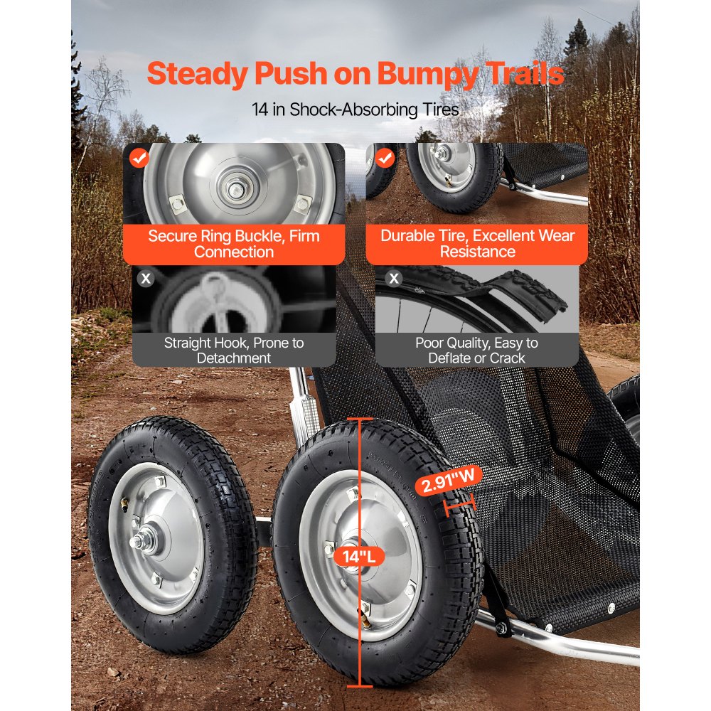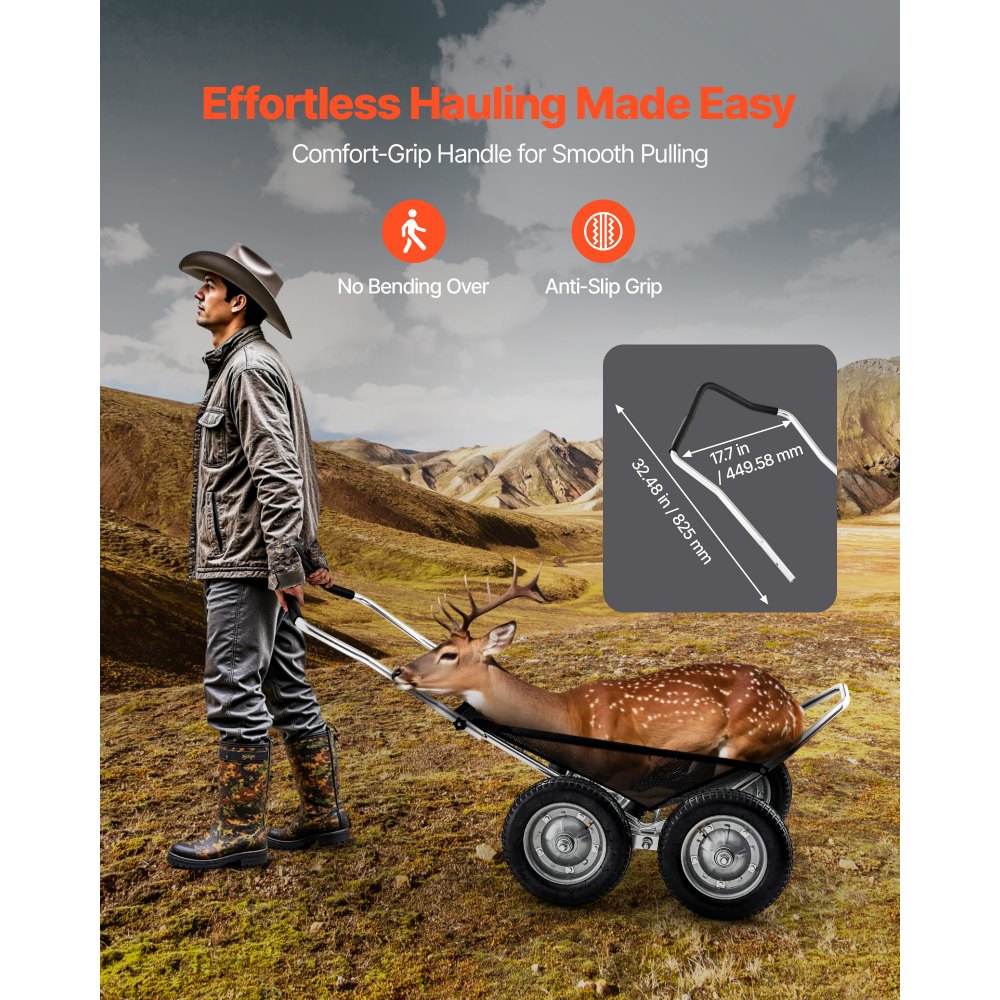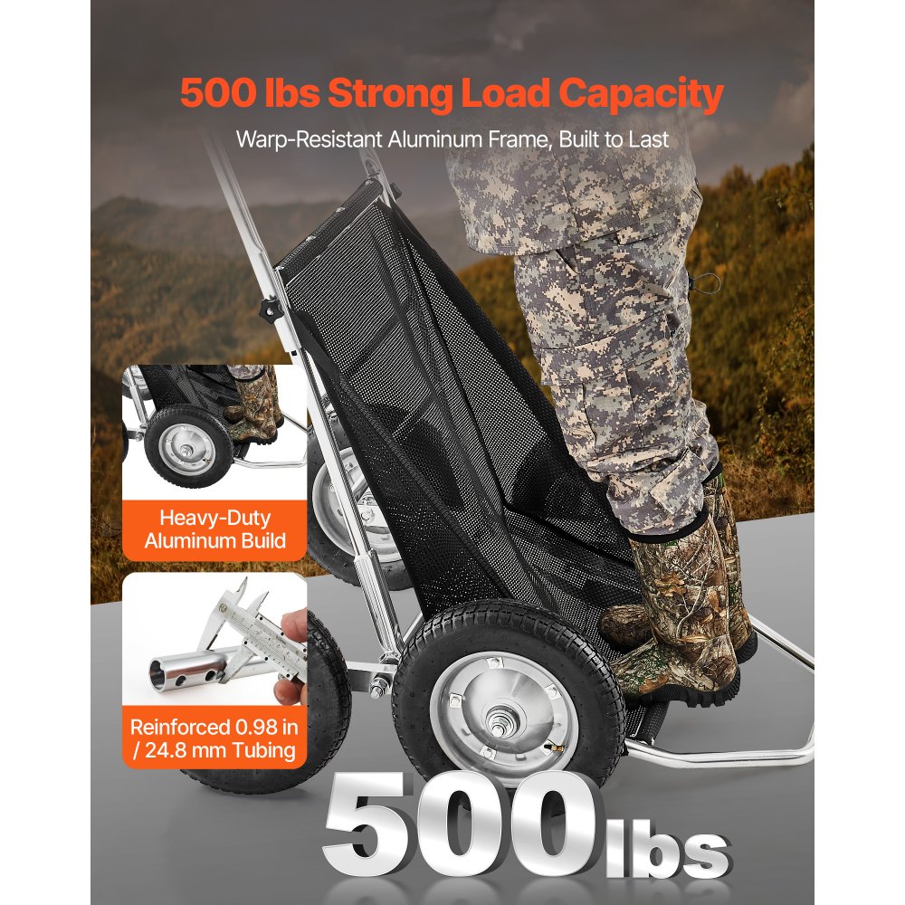 Υψηλή χωρητικότητα φορτίου: Κατασκευασμένο με πλαίσιο αλουμινίου πάχους 0,98 ιντσών (24,8 mm), αυτό το καρότσι κυνηγιού υποστηρίζει έως και 500 λίβρες (227 κιλά). Ανθεκτικό και αξιόπιστο, είναι ανθεκτικό στη φθορά και τη διάβρωση, καθιστώντας το κατάλληλο για τη μεταφορά βαρέος κυνηγετικού εξοπλισμού, θηραμάτων ή άλλων φορτίων. Ελαστικά που απορροφούν τους κραδασμούς: Εξοπλισμένο με τέσσερα φαρδιά ελαστικά με πεπιεσμένο αέρα, αυτό το καρότσι ελαφιών ελαχιστοποιεί την αναπήδηση και την ανατροπή για ομαλή κίνηση σε ανώμαλο έδαφος. Οι πείροι του γάντζου χρησιμοποιούν σχεδιασμό με δακτυλιοειδή πόρπη, προσφέροντας μεγαλύτερη σταθερότητα και αποκόλληση από τα ίσια γάντζους. Ευρύχωρος χώρος αποσκευών: Η σχάρα του καροτσιού μεταφοράς ελαφιών μας είναι κατασκευασμένη από ανθεκτικό στη φθορά νάιλον ύφασμα, με διαστάσεις 920 x 450 mm. Σε συνδυασμό με μια εκτεταμένη λαβή 449,58 x 825 mm, επιτρέπει το τράβηγμα χωρίς κόπο. Γρήγορο Δίπλωμα & Αποθήκευση: Σχεδιασμένο για γρήγορο δίπλωμα, αυτό το καρότσι κυνηγιού μπορεί να τοποθετηθεί εύκολα στο πορτμπαγκάζ σας, πίσω από πόρτες ή στη γωνία του γκαράζ. Το μικρό του μέγεθος εξοικονομεί χώρο και διευκολύνει τη μεταφορά και τη χρήση οποιαδήποτε στιγμή. Ευέλικτη χρήση: Ιδανικό για τη μεταφορά θηραμάτων, εξοπλισμού, καυσόξυλων, εξοπλισμού κατασκήνωσης ή αποσκευών, αυτό το καρότσι ελαφιών χειρίζεται εύκολα ποικίλα εδάφη όπως θάμνους, χιόνι και ορεινά μονοπάτια, καλύπτοντας ένα ευρύ φάσμα αναγκών μεταφοράς.