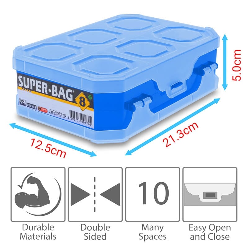 Πλαστικό κουτί οργάνωσης και αποθήκευσης, με 10 θέσεις. Δυνατότητα αποθήκευσης 2 όψεων, με διάφανο καπάκι για εύκολη αναγνώριση του περιεχομένου.Πρακτικός τρόπος κλεισίματος που σφραγίζει με κλιπ. Ιδανική για αποθήκευση μικρών πραγμάτων και ανταλλακτικών εξαρτημάτων.Ελαφριά, φορητή και πρακτική κατασκευή.Κατάλληλο για κάθε εργαστήριο τεχνικών Η/Υ αλλά και για λάτρεις του DIY. Χαρακτηριστικά: Υλικό: PP πλαστικό Θέσεις: 10 Χρώμα: Μπλε Διαστάσεις Θέσεων: 50 x 58 x 24mm / 251 x 58 x 24mm Εξωτερικές διαστάσεις: 213 x 125 x 50mm DOA 14 Ημερών
