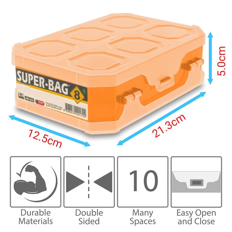 Πλαστικό κουτί οργάνωσης και αποθήκευσης, με 10 θέσεις. Δυνατότητα αποθήκευσης 2 όψεων, με διάφανο καπάκι για εύκολη αναγνώριση του περιεχομένου.Πρακτικός τρόπος κλεισίματος που σφραγίζει με κλιπ. Ιδανική για αποθήκευση μικρών πραγμάτων και ανταλλακτικών εξαρτημάτων.Ελαφριά, φορητή και πρακτική κατασκευή.Κατάλληλο για κάθε εργαστήριο τεχνικών Η/Υ αλλά και για λάτρεις του DIY. Χαρακτηριστικά: Υλικό: PP πλαστικό Θέσεις: 10 Χρώμα: Πορτοκαλί Διαστάσεις Θέσεων: 50 x 58 x 24mm / 251 x 58 x 24mm Εξωτερικές διαστάσεις: 213 x 125 x 50mm DOA 14 Ημερών