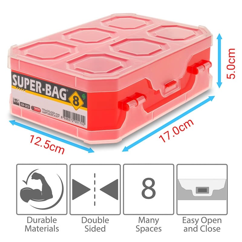 Πλαστικό κουτί οργάνωσης και αποθήκευσης, με 8 θέσεις. Δυνατότητα αποθήκευσης 2 όψεων, με διάφανο καπάκι για εύκολη αναγνώριση του περιεχομένου.Πρακτικός τρόπος κλεισίματος που σφραγίζει με κλιπ. Ιδανική για αποθήκευση μικρών πραγμάτων και ανταλλακτικών εξαρτημάτων.Ελαφριά, φορητή και πρακτική κατασκευή.Κατάλληλο για κάθε εργαστήριο τεχνικών Η/Υ αλλά και για λάτρεις του DIY. Χαρακτηριστικά: Υλικό: PP πλαστικό Θέσεις: 8 Χρώμα: Κόκκινο Διαστάσεις Θέσεων: 52 x 52 x 24mm / 161 x 52 x 24mm Εξωτερικές διαστάσεις: 170 x 125 x 50mm DOA 14 Ημερών