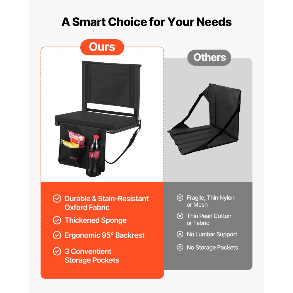 Άνετη στήριξη πλάτης: Το φορητό κάθισμα λεκάνης μας είναι κατασκευασμένο από ελαφρύ ατσάλι, παχύ αφρό υψηλής πυκνότητας και αδιάβροχο ύφασμα Oxford 600D. Με γωνία πλάτης 95° και αντικραδασμική στήριξη, μειώνει την πίεση στην πλάτη, ενώ ένα κάθισμα πλάτους 17 ιντσών/431,8 χιλιοστών ταιριάζει στους περισσότερους χρήστες για μακροχρόνια άνεση. Οργανωμένος σχεδιασμός καθισμάτων: Με πολλαπλές τσέπες για διαφορετικές χρήσεις, αυτό το κάθισμα κερκίδας ποδοσφαίρου προσφέρει μια τσέπη τηλεφώνου με φερμουάρ, αποθήκευση από διχτυωτό υλικό στην πλάτη και ποτηροθήκη. Μεταφέρετε εύκολα ποτά, σνακ, χαρτομάντιλα και αντικείμενα για τους οπαδούς, παρέχοντάς σας εύκολη πρόσβαση ενώ επευφημείτε σε αθλητικές εκδηλώσεις. Ασφαλής καρέκλα παιχνιδιού: Αυτή η φορητή πτυσσόμενη καρέκλα σταδίου διαθέτει δύο σιδερένια πλαίσια με αντιολισθητικές ταινίες στη βάση. Μπορεί να στερεωθεί σταθερά σε ξύλινες ή μεταλλικές κερκίδες, επιτρέποντας γρήγορη και εύκολη εγκατάσταση, ώστε το κάθισμά σας να παραμένει στη θέση του ενώ απολαμβάνετε αθλητικές εκδηλώσεις. Ελαφρύ & Πτυσσόμενο: Αυτό το κάθισμα κερκίδας VEVOR διαθέτει πτυσσόμενο σχεδιασμό που διπλώνει σε ένα βήμα και διαθέτει ιμάντα ώμου για εύκολη μεταφορά. Ιδανικό για μαθητές, αθλητές, γονείς και θεατές, καταλαμβάνει ελάχιστο χώρο και χωράει άνετα στο πορτμπαγκάζ ενός αυτοκινήτου. Πολυχρηστικά καθίσματα: Πτυσσόμενο και εύκολο στη μεταφορά, αυτό το επενδεδυμένο κάθισμα σταδίου με υποστήριξη πλάτης είναι ιδανικό για υπαίθριες αθλητικές εκδηλώσεις, συναυλίες σε πάρκο, πικνίκ, κάμπινγκ και δραστηριότητες στην παραλία. Παρέχει μια βολική λύση καθισμάτων για συγκεντρώσεις στο σπίτι ή σε εξωτερικούς χώρους.
