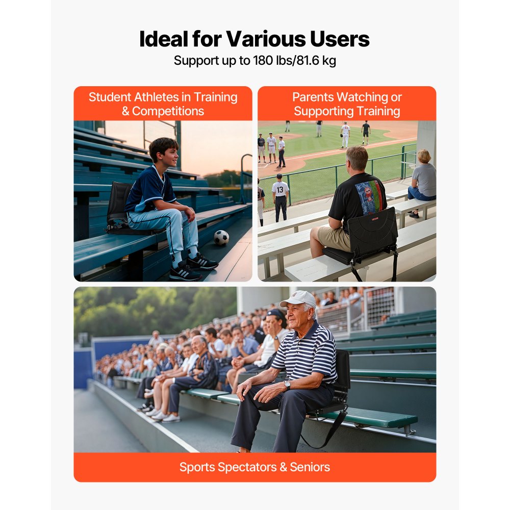 Ανθεκτικό κάθισμα άνεσης: Κατασκευασμένο από ελαφρύ ατσάλι, παχύ αφρό υψηλής πυκνότητας και κάλυμμα από ποιοτικό ύφασμα Lycra, αυτό το φορητό κάθισμα κερκίδας προσφέρει ανθεκτικότητα και άνεση. Το κάθισμα πλάτους 17 ιντσών/431,8 χιλιοστών ταιριάζει στους περισσότερους χρήστες και επιτρέπει την εύκολη κλίση για να απολαμβάνουν αθλητικούς αγώνες ή εκδηλώσεις σταδίου. Άνετα καθίσματα για παιχνίδι: Με σχέδιο μέσης σε σχήμα μπουμπουκιού, αυτό το κάθισμα κερκίδας ποδοσφαίρου είναι επενδεδυμένο στο κάθισμα και την πλάτη με πεπιεσμένο αφρό. Οι ευέλικτες γωνίες κλίσης παρέχουν αποτελεσματική στήριξη της οσφυϊκής χώρας και της πλάτης, διευκολύνοντας την ανάκλιση και την απόλαυση αθλητικών εκδηλώσεων. Σταθερό κάθισμα θέασης: Με δύο σιδερένια πλαίσια στο κάτω μέρος, αυτή η φορητή πτυσσόμενη καρέκλα σταδίου μπορεί να εγκατασταθεί γρήγορα και εύκολα στις περισσότερες κερκίδες και πάγκους. Το κάθισμά σας παραμένει στη θέση του, επιτρέποντάς σας να απολαμβάνετε πλήρως αθλητικές εκδηλώσεις χωρίς να μετακινείται ή να ανατρέπεται. Συμπαγές πτυσσόμενο: Αυτό το κάθισμα κερκίδας διαθέτει πτυσσόμενο σχεδιασμό που διπλώνει σε ένα βήμα, καθιστώντας εύκολο το πακετάρισμα και τη μεταφορά. Ιδανικό για μαθητές-αθλητές, γονείς και θεατές, καταλαμβάνει ελάχιστο χώρο και μπορεί να αποθηκευτεί εύκολα στο πορτμπαγκάζ ενός αυτοκινήτου. Πολλαπλές εφαρμογές: Το επενδεδυμένο κάθισμα σταδίου μας με υποστήριξη πλάτης διπλώνει εύκολα και είναι φορητό για υπαίθριες αθλητικές εκδηλώσεις, συναυλίες στο πάρκο, πικνίκ, κάμπινγκ ή διασκέδαση στην παραλία. Προσφέρει ένα βολικό και αξιόπιστο κάθισμα για οικιακές ή εξωτερικές κοινωνικές δραστηριότητες.