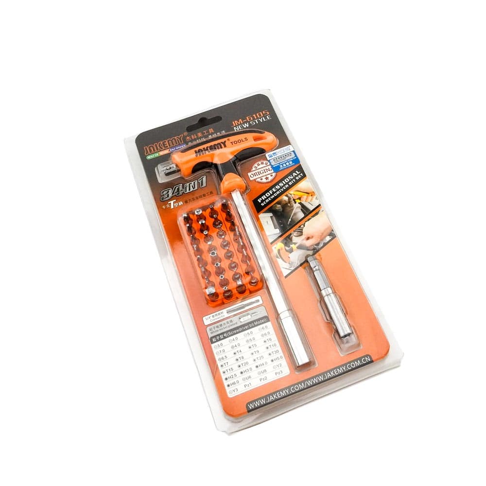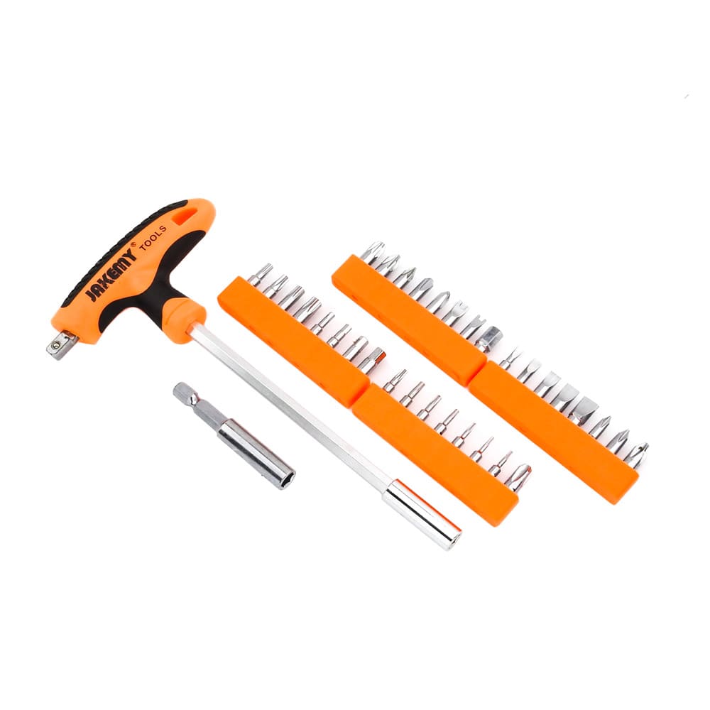 Κατσαβίδι λαβής Τ με σετ μυτών JM-6105 από την JAKEMY. Ένα σετ 32 μυτών με κατσαβίδι για όλα τα εργαστήρια ηλεκτρονικών, τεχνικών smartphone και τεχνικών Η/Υ. Το σετ περιλαμβάνει ένα κατσαβίδι λαβής Τ με υποδοχή μυτών τύπου 6.3mm και μια προέκταση 60mm ώστε να εργάζεστε με μεγαλύτερη ευκολία. Εργονομικά σχεδιασμένη λαβή, από αντιολισθητικό υλικό για άνετο κράτημα. Η μαγνητική υποδοχή μυτών, θα σας διευκολύνει στην γρήγορη αφαίρεση και εναλλαγή των μυτών. Περιεχόμενα: Εργαλεία: 1 κατσαβίδι λαβής T με υποδοχή μυτών τύπου 6.3mm 1 μεταλλική προέκταση 60mm για επιμήκυνση του κατσαβιδιού Μύτες: 32 PCS 6,3*25mm από κράμα χρωμίου Slotted: 3.0/ 4.0/ 5.0/ 6.0/ 7.0 Phillips: 4.0/ 5.0/ 6.0/ 6.5 Torx: T4/ T5/ T6/ T7/ T8/ T9/ T10/ T15/ T20/ T25/ T30 Pozi: Pz1/ Pz2/ Pz3 Tri-Wing: Y2.0/ Y3.0 Hex: H2.5/ H3.0/ H4.0/ H5.0/ H6.0 U-Shaped: U6/ U8 DOA 14 ημερών