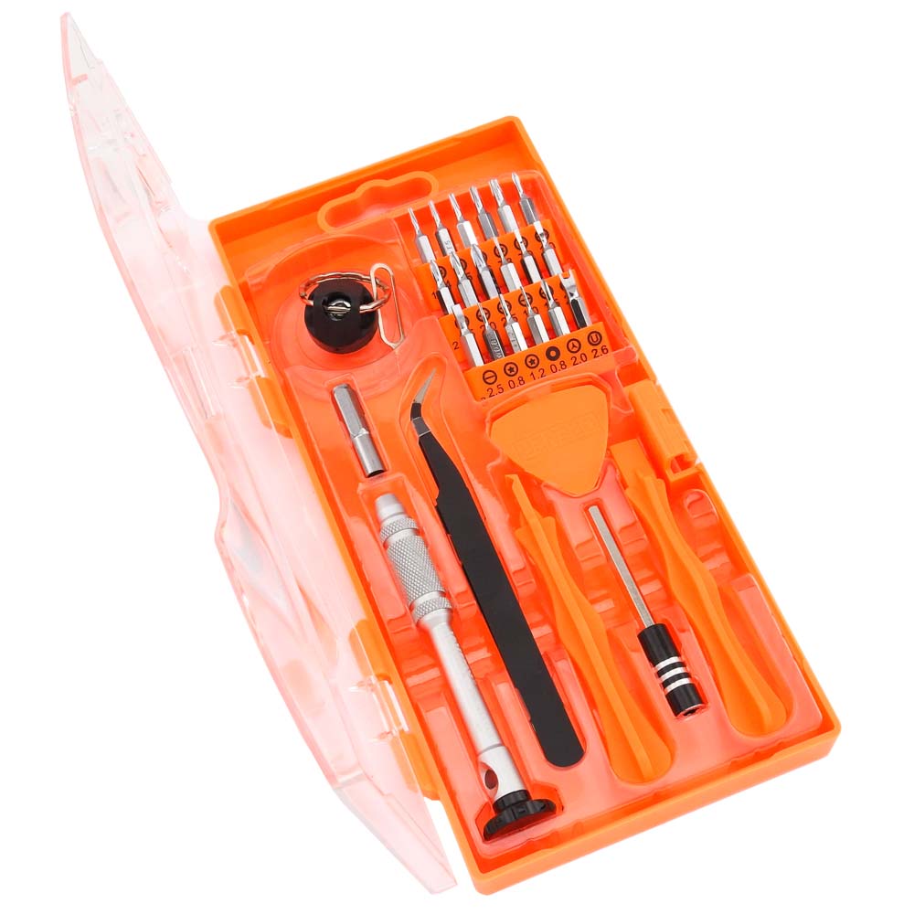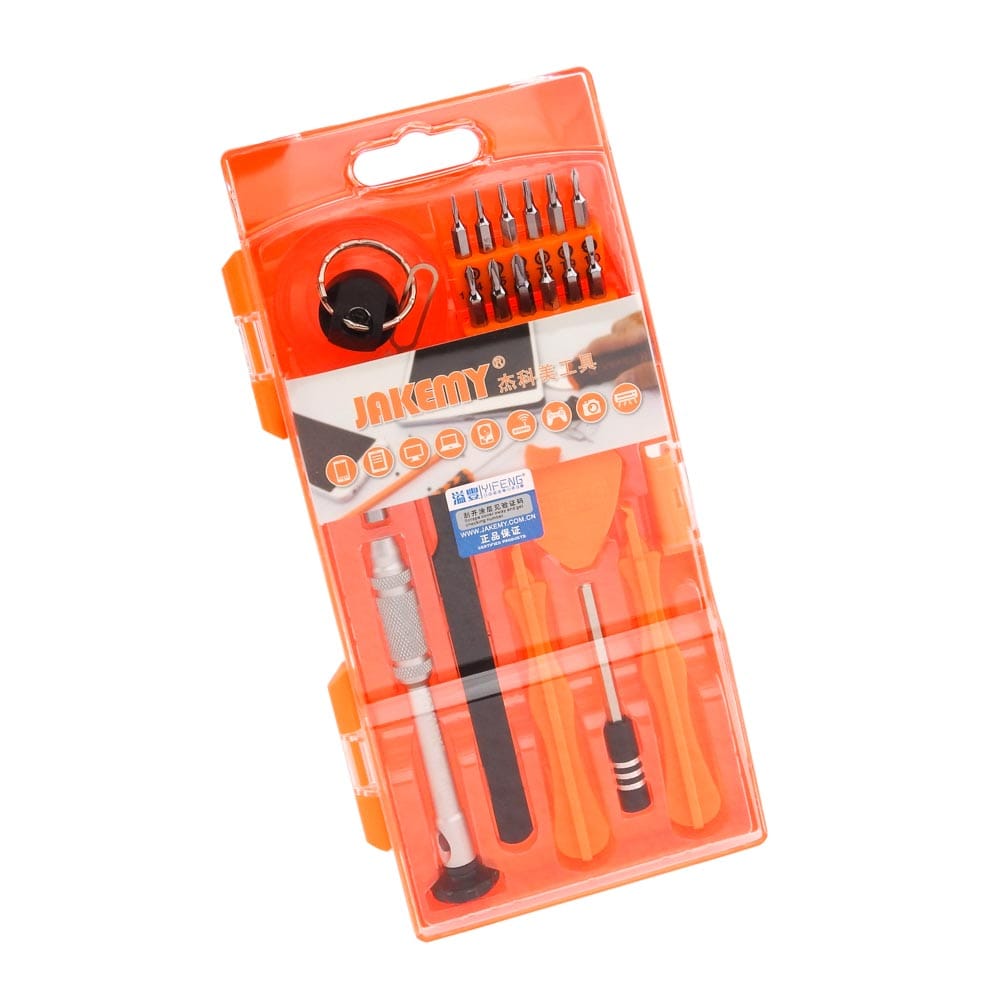 Σετ Κατσαβίδι με μύτες JM-8144 από τήν JAKEMY. Ένα σετ 17 μυτών με κατσαβίδι για όλα τα εργαστήρια ηλεκτρονικών, τεχνικών smartphones και τεχνικών Η/Υ. Το σετ περιέχει 1 μεταλικό κατσαβίδι αντιολισθητικό με περιστρεφόμενη λαβή , 1 προέκταση 60mm, 1 πένα ανοίγματος, 1 ανταπτοράκι για τις μύτες,1 γωνιακή προσέλα (T1-15), 2 πλαστικά Stick ανοίγματος και 1 βεντούζα με ακίδα για το Sim Tray. Η σύνδεση των μυτών (bits) με μαγνήτη διευκολύνει την αφαίρεση και αλλαγή τους από την προέκταση και την βάση του κατσαβιδιού. Χαρακτηριστικά: Μύτες: 18 PCS 4*24mm κράμα χρωμίου Slotted: 1/ 1.5/ 2/ 2.5 Phillips: 1/ 1.5/ 2/ 2.5 Torx: T4/ T5/ T6/ T8/ T9 Tri-Wing: Y2 U-Shaped: U2.6 Pentable(Star): 0.8/ 1.2 Round: R0.8 DOA 14 ημερών
