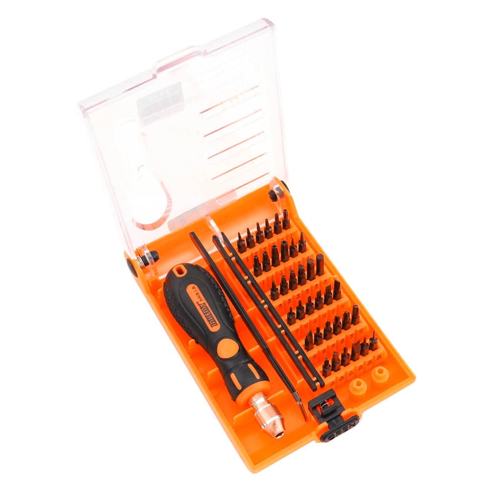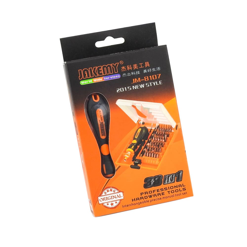 Σετ μύτες με κατσαβίδι JM-8107 από την JAKEMY. Μια κασετίνα με 36 μύτες, κατσαβίδι και μια προσέλα ιδανικό για όλα τα εργαστήρια ηλεκτρονικών και τεχνικών smartphone. Το σετ περιέχει 1 κατσαβίδι, 1 γωνιακή προσέλα (T1-15) και 36 μύτες. Εργονομικά σχεδιασμένη λαβή ανθεκτική στην ολίσθηση για άνετη συγκράτηση. Η σύνδεση των μυτών (bits) με μαγνήτη διευκολύνει την αφαίρεση και αλλαγή τους από την βάση του κατσαβιδιού.\ Χαρακτηριστικά: Μύτες: 36 PCS 4*28mm Slotted: 1/ 1.5/ 2/ 2.5/ 3/ 3.5/ 4 Phillips: 1/ 1.5/ 2/ 2.5/ 3.5 Torx: T3/ T4/ T5/ T6/ T7/ T8/ T9/ T10/ T15/ T20 Hex: H0.9/ H1.3/ H2/ H2.5/ H3/ H3.5/ H4 Tri-Wing: Y2 Triangle: 2/ 2.3 Round: R0.8 Pentable (Star): 0.8 U-Shaped: U2.6 DOA 14 ημερών