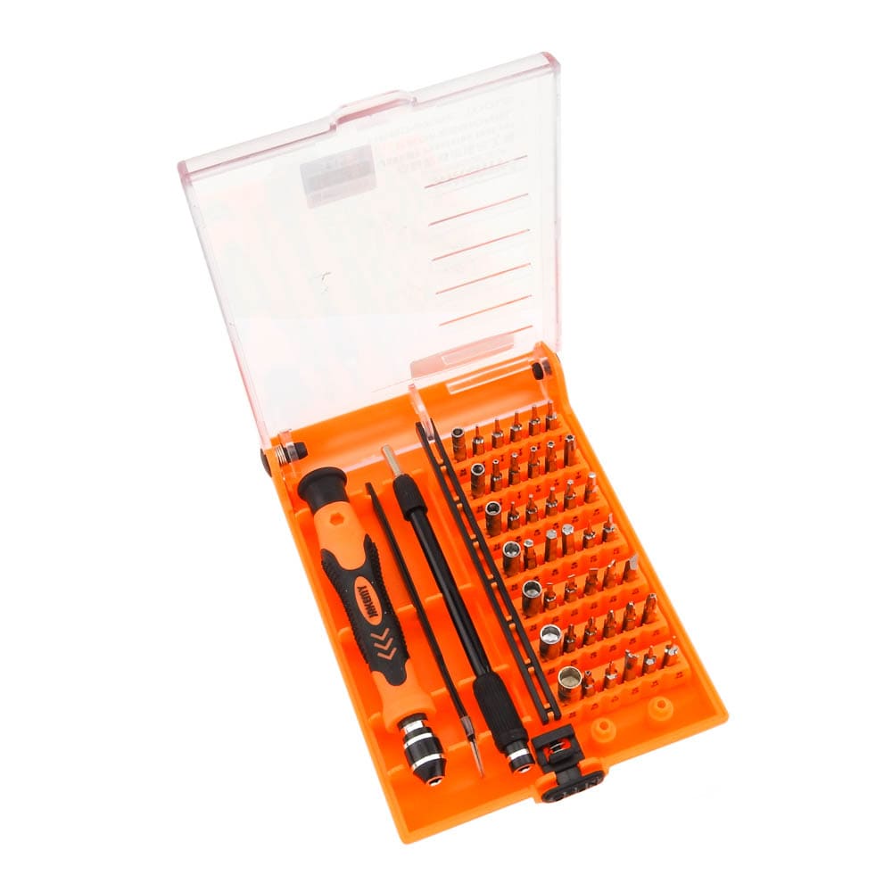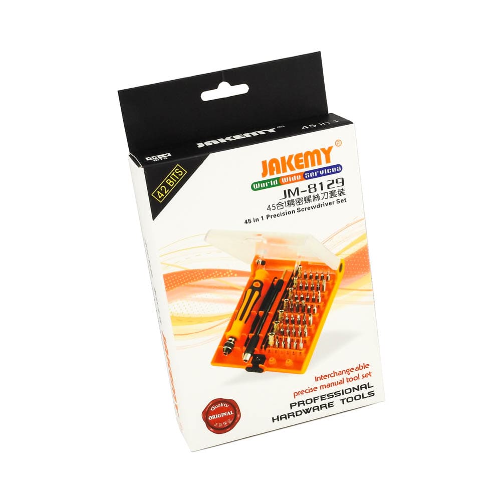 Σετ Κατσαβίδι με μύτες JM-8129 από την JAKEMY. Ένα σετ 42 μυτών με κατσαβίδι για όλα τα εργαστήρια ηλεκτρονικών, τεχνικών smartphones και τεχνικών Η/Υ. Το σετ περιέχει 1 κατσαβίδι με περιστρεφόμενη λαβή, 1 προέκταση 130mm με την δυνατότητα να λυγίζει, 1 γωνιακή προσέλα(T1-15) και 42 μύτες. Εργονομικά σχεδιασμένη λαβή ανθεκτική στην ολίσθηση για άνετο κράτημα. Η σύνδεση των μυτών (bits) με μαγνήτη διευκολύνει την αφαίρεση και αλλαγή τους από την προέκταση ή την βάση του κατσαβιδιού. Χαρακτηριστικά: Μύτες: 42 PCS 4*28mm κράμα χρωμίου Slotted: 1/ 1.5/ 2/ 2.5/ 3/ 3.5/ 4 Phillips: 1/ 1.5/ 2/ 2.5/ 3.5 Torx: T3/ T4/ T5/ T6/ T7/ T8/ T9/ T10/ T15/ T20 Hex: H0.9/ H1.3/ H1.5/ H2/ H2.5/ H3/ H3.5/ H4 Tri-Wing: Y2 Triangle: 2 Pentable(Star): 0.8 U-Shaped: U2.6 Round: R0.8 Socket(καρυδάκια): M2.5/ M3/ M3.5/ M4/ M4.5/ M5/ M5.5 DOA 14 ημερών