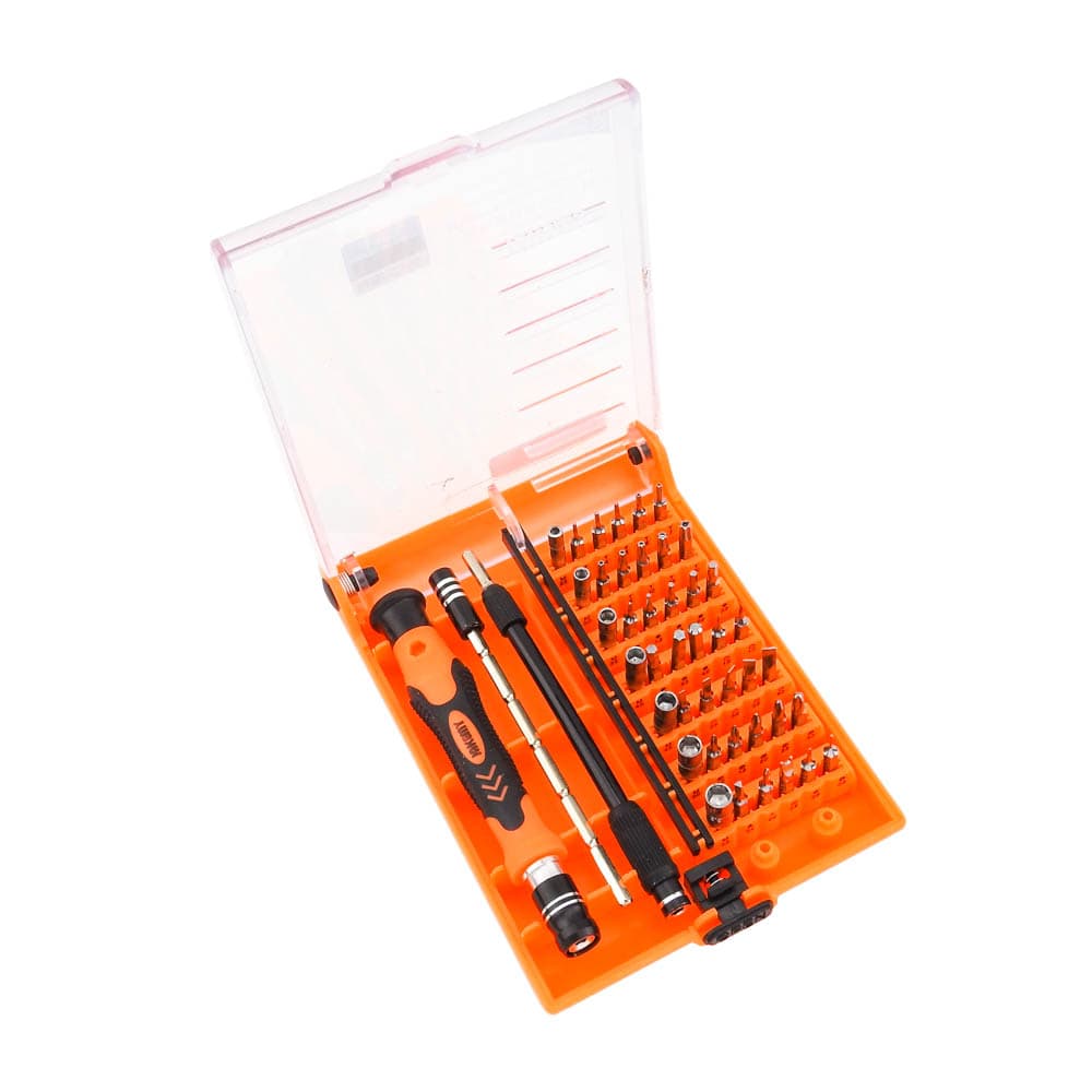 Σετ Κατσαβίδι με μύτες JM-8132 από την JAKEMY. Ένα σετ 42 μυτών με κατσαβίδι για όλα τα εργαστήρια ηλεκτρονικών, τεχνικών smartphones και τεχνικών Η/Υ. Το σετ περιέχει 1 κατσαβίδι με περιστρεφόμενη λαβή, 1 προέκταση 120mm 5 θέσεων, 1 προέκταση 130mm με τη δυνατότητα να λυγίζει και 42 μύτες . Εργονομικά σχεδιασμένη λαβή ανθεκτική στην ολίσθηση για άνετο κράτημα. Η σύνδεση των μυτών (bits) με μαγνήτη διευκολύνει την αφαίρεση και αλλαγή τους από τις προεκτάσεις του κατσαβιδιού. Χαρακτηριστικά: Μύτες: 42 PCS 4*28mm κράμα χρωμίου Slotted: 1/ 1.5/ 2/ 2.5/ 3/ 3.5/ 4 Phillips: 1/ 1.5/ 2/ 2.5/ 3.5 Torx: T3/ T4/ T5/ T6/ T7/ T8/ T9/ T10/ T15/ T20 Hex: H0.9/ H1.3/ H1.5/ H2/ H2.5/ H3/ H3.5/ H4 Tri-Wing: Y2 Triangle: 2 Pentable(Star): 0.8 U-Shaped: U2.6 Round: R0.8 Socket(καρυδάκια): M2.5/ M3.0/ M3.5/ M4.0/ M4.5/ M5.0/ M5.5 DOA 14 ημερων