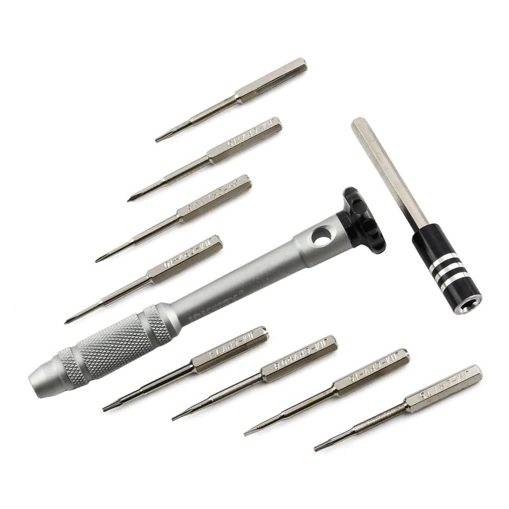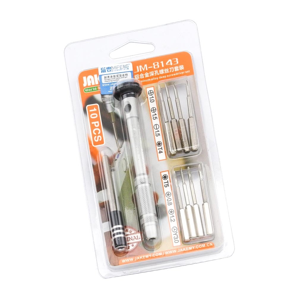 Σετ Κατσαβίδι με μύτες JM-8143 από την JAKEMY. Ένα σετ 8 μυτών με κατσαβίδι αλουμινίου και 1 προέκταση 60mm, κατάλληλο για όλα τα εργαστήρια ηλεκτρονικών, τεχνικών smartphone και τεχνικών Η/Υ. Εργονομικά σχεδιασμένη λαβή ανθεκτική στην ολίσθηση για άνετο κράτημα. Η σύνδεση των μυτών (bits) με μαγνήτη διευκολύνει την αφαίρεση και αλλαγή τους από την βάση ή την προέκταση του κατσαβιδιού. Χαρακτηριστικά: Μύτες: 8 PCS 4*45mm κράμα χρωμίου Slotted: 1.5 Phillips: 1/ 1.5 Torx: T4/ T5 Star: 0.8/ 1.2 Tri-Wing: Y3 DOA 14 ημερών