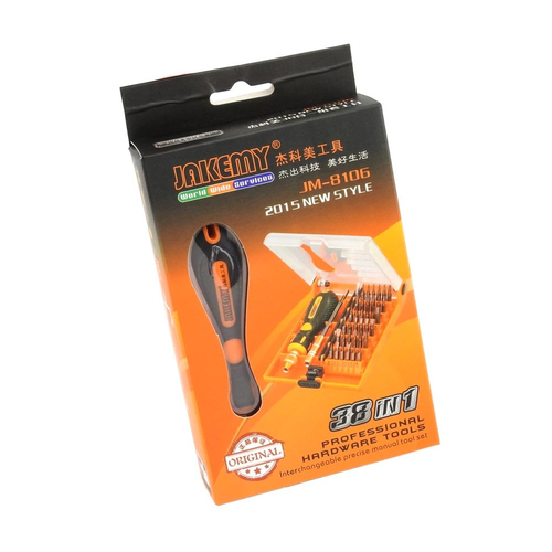 Σετ κατσαβίδι με μύτες JM-8106 από την JAKEMY. Ένα σετ 36 μυτών με κατσαβίδι χρήσιμο για όλα τα εργαστήρια ηλεκτρονικών, τεχνικών smartphones και τεχνικών Η/Υ. Το σετ σας προσφέρει ένα κατσαβίδι 105mm με μαγνητική υποδοχή μυτών τύπου 4*28mm ιδανικό για όλα τα laptops, tablets, smartphones και όχι μόνο. Με την εργονομική λαβή μπορείτε να δουλεύετε ξεκούραστα ακόμη και όταν πρόκειται για πολύωρη και συνεχή εργασία. Επίσης η μαγνητική υποδοχή μυτών θα σας διευκολύνει στην γρήγορη αφαίρεση και εναλλαγή των μυτών. Περιεχόμενα: Εργαλεία: 1 κατσαβίδι μήκους 105mm για μύτες τύπου 4*28mm, με μαγνητική υποδοχή και αντιολισθητική λαβή 1 απλή προέκταση 100mm Μύτες: 36 PCS 4*28mm κράμα χρωμίου-χάλυβα Slotted: 1/ 1.5/ 2/ 2.5/ 3/ 3.5/ 4 Phillips: 1/ 1.5/ 2/ 2.5/ 3.5 Torx: T3/ T4/ T5/ T6/ T7/ T8/ T9/ T10/ T15/ T20 Hex: H0.9/ H1.3/ H1.5/ H2/ H2.5/ H3/ H3.5/ H4 Tri-Wing: Y2 Triangle: 2/ 2.3 Pentable(Star): 0.8 U-Shaped: U2.6 Round: R0.8 DOA 14 ημερών
