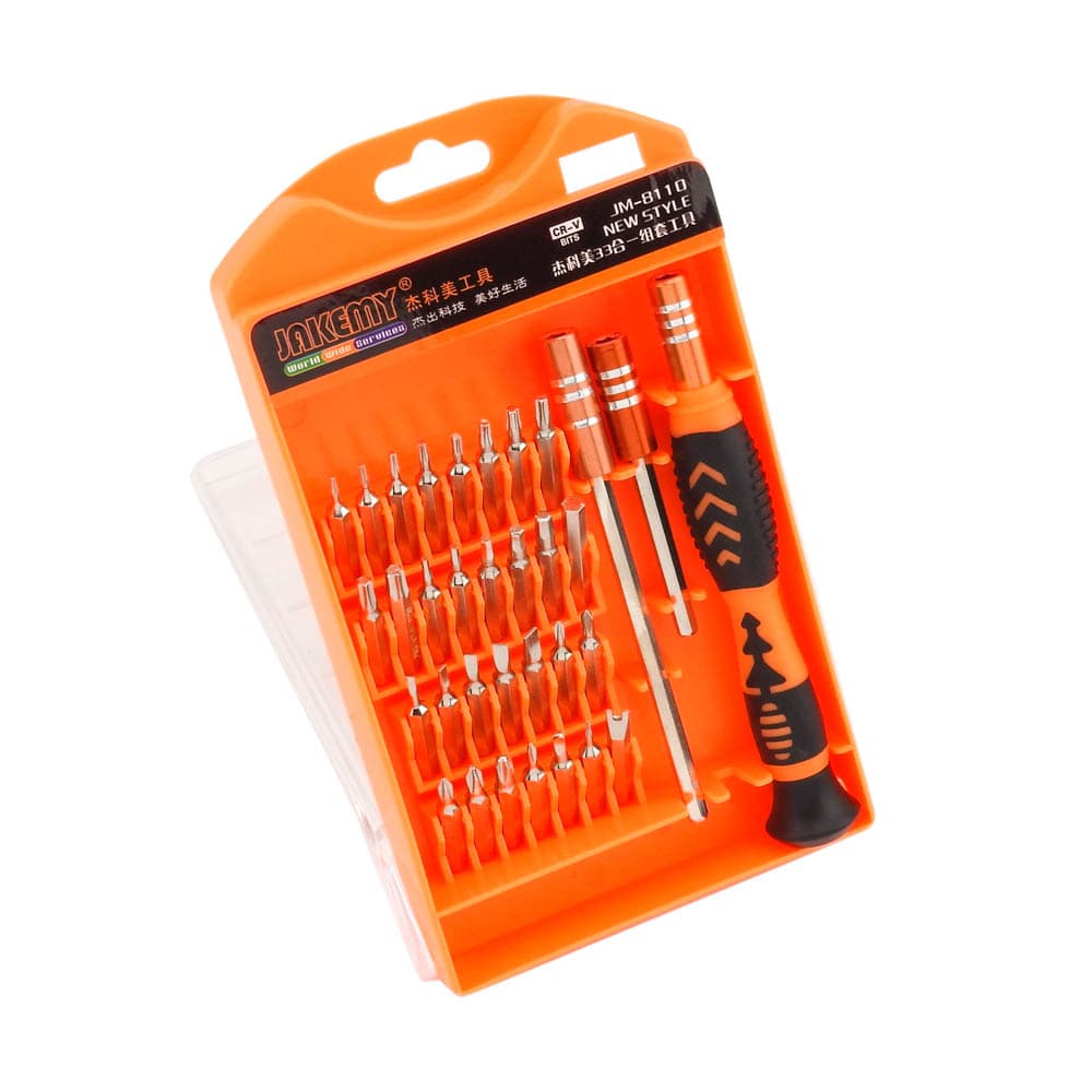 Σετ κατσαβίδι με μύτες JM-8110 από την JAKEMY. Ένα σετ 30 μυτών με κατσαβίδι, χρήσιμο για όλα τα εργαστήρια ηλεκτρονικών, τεχνικών smartphones και τεχνικών Η/Υ. Το σετ σας προσφέρει ένα κατσαβίδι 115mm με περιστρεφόμενη λαβή και μαγνητική υποδοχή μυτών τύπου 4*28mm ιδανικό για όλα τα laptops, tablets, smartphones και όχι μόνο. Με την εργονομική λαβή μπορείτε να δουλεύετε ξεκούραστα ακόμη και όταν πρόκειται για πολύωρη και συνεχή εργασία. Τέλος η μαγνητική υποδοχή μυτών θα σας διευκολύνει στην γρήγορη αφαίρεση και εναλλαγή των μυτών. Περιεχόμενα: Εργαλεία: 1 κατσαβίδι-καστάνια μήκους 121mm για μύτες τύπου 4*28mm, με μαγνητική υποδοχή και αντιολισθητική λαβή 1 προέκταση 100mm 1 προέκταση 60mm Μύτες: 30 PCS 4*28mm κράμα χρωμίου-χάλυβα Slotted: 1.5/ 2/ 2.5/ 3/ 3.5 Phillips: 1.5/ 2/ 2.5/ 3/ 3.5 Torx: T3/ T4/ T5/ T6/ T7/ T8/ T9/ T10/ T15/ T20 Hex: H1.3/ H1.5/ H2/ H2.5/ H3/ H4 Tri-Wing: Y2 Triangle: 2 Pentable(Star): 0.8 U-Shaped: U2.6 DOA 14 ημερών