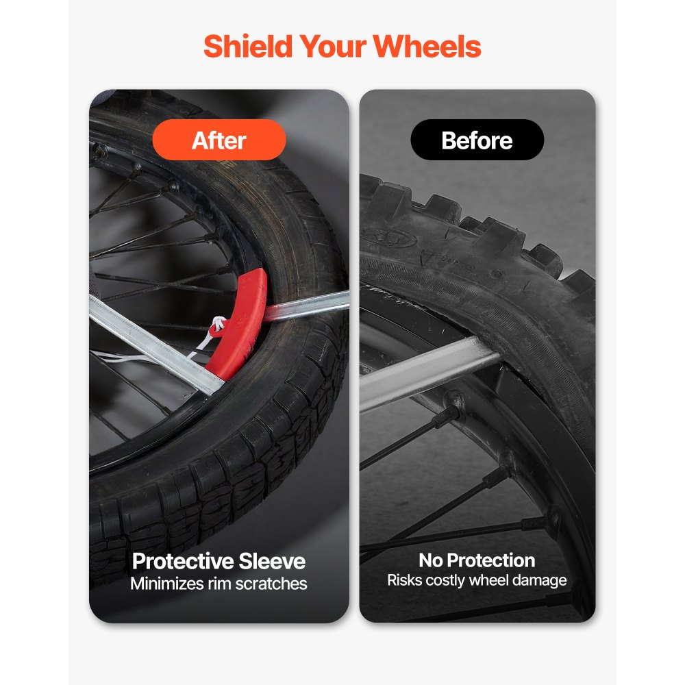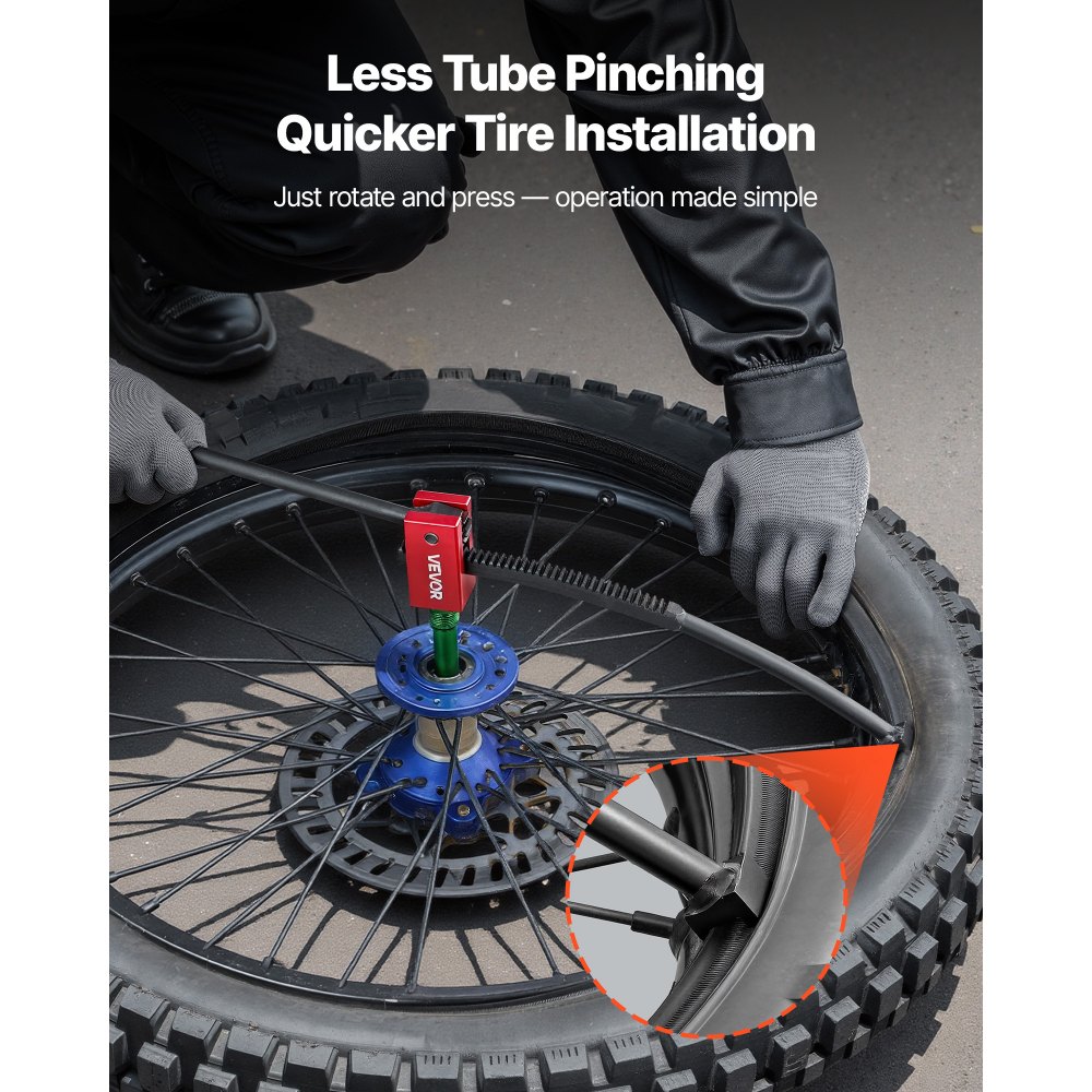 Σωλήνας με μειωμένο σφίξιμο: Αυτό το κιτ εργαλείων αλλαγής ελαστικών για μοτοσικλέτα χρησιμοποιεί μια διαδικασία αλλαγής ελαστικών χωρίς γρατσουνιές. Ο σχεδιασμός αυλακώσεων διασφαλίζει ότι το ελαστικό τοποθετείται γρήγορα στη ζάντα και μειώνει τη ζημιά στο ελαστικό και τον εσωτερικό σωλήνα, ελαχιστοποιώντας τον κίνδυνο κοπής. Κατάλληλο για μεγέθη ελαστικών 16"-21": Ο οδοντωτός καμπυλωτός μοχλός μπορεί εύκολα να ρυθμιστεί ανάλογα με το μέγεθος του ελαστικού, κατάλληλος για ελαστικά 16"-21" (406-533 mm). Αυτό το εργαλείο αλλαγής ελαστικών για μοτοσικλέτα διαθέτει 4 προσαρμογείς άξονα για να ταιριάζει σε διαμέτρους άξονα από 15-25 mm (0,6"-1"). 2 κυρτά σίδερα ελαστικών: Το μηχάνημα αλλαγής ελαστικών για μοτοσικλέτες dirt συνοδεύεται από 2 σίδερα ελαστικών για την αφαίρεση και την τοποθέτηση ελαστικών—δεν χρειάζονται επιπλέον εργαλεία. Ο κυρτός σχεδιασμός κρατάει το ελαστικό με ασφάλεια και αποτρέπει την ολίσθηση. Προστατευτικό κάλυμμα ζάντας: Το σύστημα αλλαγής ελαστικών μοτοσικλέτας περιλαμβάνει ένα προστατευτικό κάλυμμα ζάντας που λειτουργεί ως ασπίδα ανάμεσα στα σκληρά εργαλεία και το φινίρισμα του τροχού σας. Αυτό το κρίσιμο αξεσουάρ διασφαλίζει ότι η ζάντα σας παραμένει χωρίς γρατσουνιές. Πλήρες κιτ αλλαγής ελαστικών για μοτοσικλέτες: Αυτή η συμπαγής συσκευή αλλαγής ελαστικών για μοτοσικλέτες περιλαμβάνει ένα εργαλείο τοποθέτησης ελαστικών και 2 σίδερα ελαστικών. Είναι ευρέως συμβατή με μοτοσικλέτες, motocross και enduro, επιτρέποντάς σας να αλλάζετε εύκολα ελαστικά στο σπίτι.