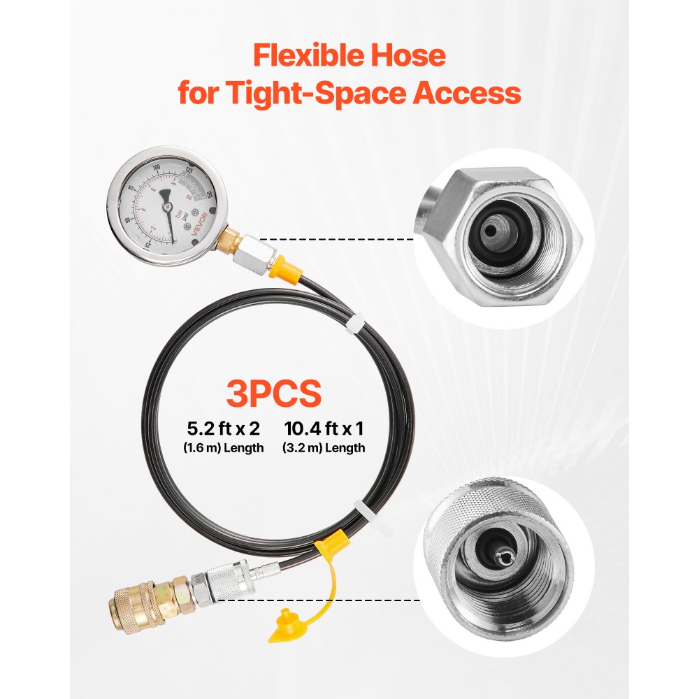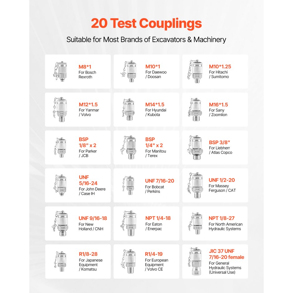 Πλήρες κιτ δοκιμής υδραυλικής πίεσης: Αυτό το κιτ καλύπτει πέντε εύρη πίεσης (10/60/160/400/600 Bar). Περιλαμβάνει πέντε μετρητές, είκοσι συνδέσμους, τέσσερις ταχυσύνδεσμους και τρεις εύκαμπτους σωλήνες. Είναι σχεδιασμένο για υδραυλικά συστήματα χαμηλής, μέσης και υψηλής πίεσης. Αξιόπιστη ακρίβεια: Το κιτ υδραυλικών μετρητών μας διαθέτει μετρητές γεμάτους με γλυκερίνη που αντιστέκονται στις διαρροές, αποτρέπουν το κιτρίνισμα, μειώνουν την εσωτερική τριβή και αποσβένουν τους κραδασμούς. Το περίβλημα από ανοξείδωτο ατσάλι 304 εξασφαλίζει αντοχή, αντοχή στη θερμότητα και στη διάβρωση. Ευρεία συμβατότητα: Αυτό το κιτ υδραυλικού μετρητή πίεσης καλύπτει τύπους σπειρωμάτων G, M, UNF και NPT και περιλαμβάνει ταχυσύνδεσμους τύπου B και τύπου C για πολλαπλά υδραυλικά συστήματα. Ο εύκαμπτος σωλήνας εκτείνεται εύκολα σε στενά ή δυσπρόσιτα σημεία δοκιμών. Εύκολη αποθήκευση και φορητότητα: Με αυτό το κιτ υδραυλικού μετρητή, όλα τα εργαλεία χωράνε σε μία θήκη, διατηρώντας τα ασφαλή, οργανωμένα και προστατευμένα από απώλεια ή ζημιά. Ευέλικτες εφαρμογές: Το κιτ υδραυλικής δοκιμής λειτουργεί για συχνές επιθεωρήσεις εκσκαφέων (Caterpillar, Komatsu και άλλων εμπορικών σημάτων), φορτωτών και μπουλντόζων. Ιδανικό για συντήρηση συστημάτων, γεωργικά μηχανήματα, βαθμονόμηση πίεσης και διαγνωστικά πολλαπλών βαλβίδων.