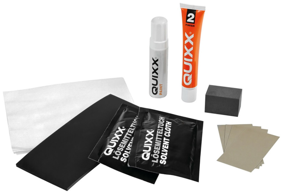 Περιεχόμενο συσκευασίας : 2 φακελάκια με ένα διχτυωτό πανί βουτηγμένο σε ειδικό διαλυτικό το καθένα, 1 ειδικό κύβο από ελαστικό, 4 λειαντικά χαρτιά P3000, 1 λειαντικός κύβος, 1 σωληνάριο ειδικού στιλβωτικού QUIXX "Finish“, 3 πανιά στίλβωσης, 1 ζευγάρι γάντια, 1 οδηγίες χρήσης