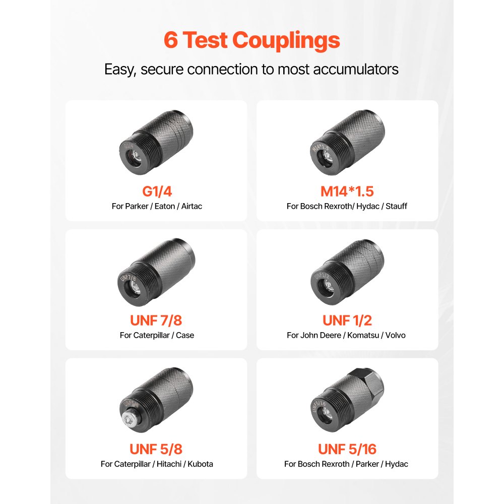 Πλήρωση και δοκιμή αζώτου: Αυτό το κιτ δοκιμής υδραυλικής πίεσης μετρά 1500/4000/6000 PSI. Περιλαμβάνει τρία μανόμετρα, έξι συνδέσμους, έναν εύκαμπτο σωλήνα, έναν προσαρμογέα και έναν σύνδεσμο πλήρωσης αζώτου για την πλήρωση αζώτου συσσωρευτών και τη δοκιμή πίεσης. Ευρεία συμβατότητα: Ο προσαρμογέας και ο σύνδεσμος αζώτου του κιτ υδραυλικού μετρητή έχουν σχεδιαστεί για πλήρωση συσσωρευτών. Ο προσαρμογέας G5/8 σε CGA580 ταιριάζει στις κύριες μάρκες σφυριών/θραυστήρων. Σωλήνας 6,6 ποδιών με αρσενικό σπείρωμα M10 και θηλυκό σπείρωμα G5/8 για εύκολη σύνδεση. Αξιόπιστη ακρίβεια: Το κιτ υδραυλικού μετρητή πίεσης μας διαθέτει μετρητές γεμάτους με γλυκερίνη που αντιστέκονται στις διαρροές, αποτρέπουν το κιτρίνισμα, μειώνουν την εσωτερική τριβή και αποσβένουν τους κραδασμούς. Το περίβλημα από ανοξείδωτο ατσάλι 304 εξασφαλίζει αντοχή, αντοχή στη θερμότητα και στη διάβρωση. Εύκολη αποθήκευση και φορητότητα: Με αυτό το κιτ υδραυλικού μετρητή, όλα τα εργαλεία χωράνε σε μία θήκη, διατηρώντας τα ασφαλή, οργανωμένα και προστατευμένα από απώλεια ή ζημιά. Ευέλικτες εφαρμογές: Το κιτ υδραυλικής δοκιμής είναι ιδανικό για συχνές επιθεωρήσεις βαρέος εξοπλισμού, όπως εκσκαφείς, φορτωτές και μπουλντόζες. Είναι κατάλληλο για συντήρηση συστημάτων, γεωργικά μηχανήματα, βαθμονόμηση πίεσης και διαγνωστικά πολλαπλών βαλβίδων.