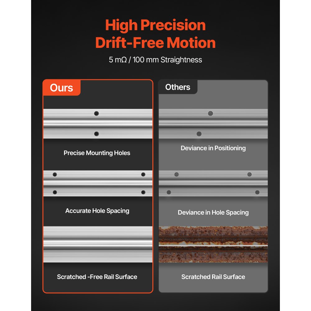 Κιτ γραμμικής ράγας SBR25: Περιλαμβάνει δύο γραμμικές ράγες 47,24 ιντσών (1200 mm) και τέσσερα μπλοκ ολίσθησης. Είναι συμβατό με μηχανές κοπής, λείανσης, φρέζας, τρυπάνι και άλλο εξοπλισμό. Προστασία από σκουριά και διάβρωση: Κατασκευασμένο από άξονες από ανθρακούχο χάλυβα υψηλής σκληρότητας (HRC58–62) και μπλοκ και στηρίγματα από κράμα αλουμινίου. Κάθε γραμμική ράγα είναι επικαλυμμένη με ένα στρώμα ηλεκτρολυτικής επιμετάλλωσης άνω των 10 μm για αντοχή στη σκουριά και τη διάβρωση, ακόμη και σε υγρά υπόγεια. Αθόρυβη και ομαλή ολίσθηση: Τα ενσωματωμένα μπλοκ ολίσθησης με ρουλεμάν προσφέρουν αθόρυβη κίνηση χαμηλής τριβής, ενώ παράλληλα συγκρατούν σφιχτά τον άξονα για σταθερή γραμμική κίνηση. Λιγότερος θόρυβος, λιγότερη φθορά, μεγαλύτερη ακρίβεια—κάθε φορά που κινείστε. Υψηλή ακρίβεια, χωρίς απόκλιση: Με φινίρισμα επιφάνειας 0,1–0,22 μm και ευθύτητα 5 mΩ, σε συνδυασμό με ακριβή διάμετρο και απόσταση οπών, αυτό το γραμμικό σετ ραγών ολίσθησης εξασφαλίζει εύκολη εγκατάσταση και επαναλαμβανόμενη τοποθέτηση, ακόμη και σε μεγάλες αποστάσεις διαδρομής. Εύκολη εγκατάσταση: Δεν απαιτούνται επιπλέον εργαλεία εγκατάστασης. Σχεδιασμένο με γνώμονα την απλότητα, αυτό το κιτ γραμμικής κίνησης οδηγού εγκαθίσταται γρήγορα. Είναι κατάλληλο για συναρμολόγηση DIY ή αντικαταστάσεις ραγών.