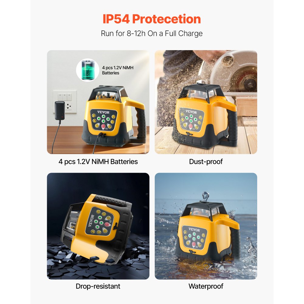 Περιστροφική σάρωση 360°: Το εργαλείο αυτοεπιπέδωσης έχει ανοχή ±3° και επιτρέπει και χειροκίνητη ευθυγράμμιση. Με περιστρεφόμενη μονάδα 360° και λειτουργία κατευθυντικής σάρωσης, παρέχει επιλογές γωνίας σάρωσης (5°-45°-90° -160°), επιτρέποντάς σας να καλύψετε ολόκληρο τον χώρο. Απόσταση εργασίας 500 m: Το περιστρεφόμενο αλφάδι λέιζερ μας διαθέτει απόσταση εργασίας 1650 ft / 500 m και καθαρή έξοδο λέιζερ για βιομηχανικές και εμπορικές εφαρμογές. Διαθέτει τρίποδο και μετρητή σταδίου για να σας βοηθήσει να καταγράφετε και να ερμηνεύετε με ακρίβεια τα σήματα λέιζερ. Επαναφορτιζόμενη μπαταρία: Το εργαλείο λέιζερ επιπέδου μας τροφοδοτείται από 4 μπαταρίες NiMH 1.2V που λειτουργούν για 8-12 ώρες με πλήρη φόρτιση (συμπεριλαμβανομένου του φορτιστή), διασφαλίζοντας ότι θα μπορείτε να ολοκληρώνετε τις εργασίες σας αποτελεσματικά χωρίς να χρειάζεται να τις επαναφορτίζετε συχνά. Υλικό υψηλής ποιότητας: Το φιλικό προς το χρήστη περιστροφικό αλφάδι λέιζερ σας προσφέρει ηρεμία με την βαθμολογία IP55. Διαθέτει ένα ανθεκτικό, σύνθετο περίβλημα υψηλής αντοχής που προστατεύει τον εσωτερικό μηχανισμό από το νερό και τη σκόνη, εξασφαλίζοντας μακροχρόνια αξιοπιστία. Εύκολη χρήση: Ο διαισθητικός σχεδιασμός διευκολύνει την εγκατάσταση. Περιλαμβάνει τηλεχειριστήριο 65 ft / 19,8 m για λειτουργία από απόσταση, σπείρωμα τρίποδα 5/8" (15,9 mm) για ασφαλή τοποθέτηση και πλήρη συμβατότητα με τον υπάρχοντα εξοπλισμό για βολική και ευέλικτη χρήση.