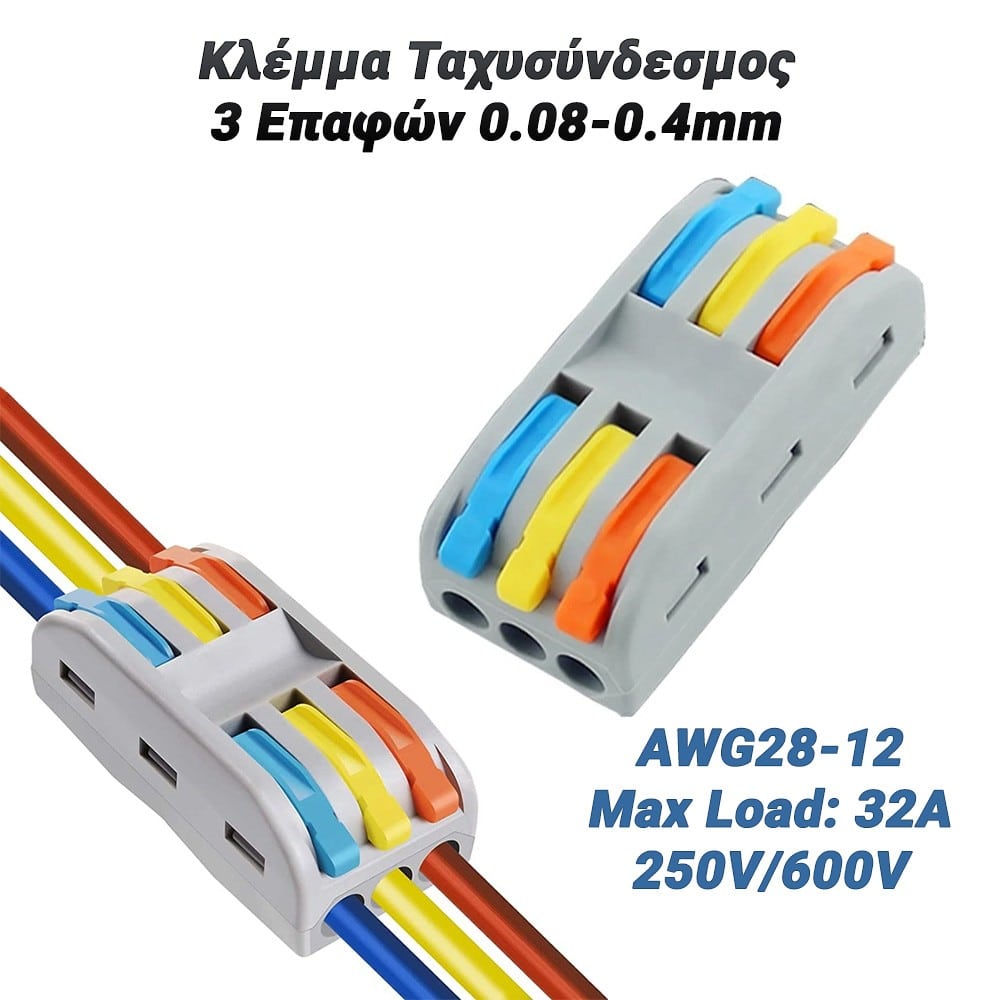 Η κλέμμα ταχυσύνδεσμος με 3 επαφές 0.08-0.4mm είναι η ιδανική λύση για την εύκολη και ασφαλή σύνδεση καλωδίων. Σχεδιασμένα για να παρέχουν αξιόπιστη σύνδεση με εύκολη εφαρμογή, αυτή η κλέμμα ταχυσύνδεσμος είναι ιδανική για εργασίες σε αυτοκίνητα, σκάφη, οικιακές εγκαταστάσεις και άλλες εφαρμογές. Με εύρος σύνδεσης από 0.08mm έως 0.4mm, καλύπτουν μια ευρεία γκάμα καλωδίων, εξασφαλίζοντας σταθερή και ασφαλή σύνδεση. Η εύκολη τοποθέτηση και η αξιόπιστη επαφή την καθιστούν ιδανική για εφαρμογές που απαιτούν γρήγορη και ασφαλή σύνδεση καλωδίων. Κατασκευασμένη από υλικά υψηλής ποιότητας για αντοχή και αξιοπιστία. Είναι η ιδανική επιλογή για επαγγελματικές και ερασιτεχνικές εφαρμογές όπου η αξιοπιστία και η ευκολία χρήσης είναι ζωτικής σημασίας. Τεχνικά χαρακτηριστικάΔιατομή αγωγού: 0.08mm έως 4mm² (AWG28-12)Μέγιστο φορτίο: 32AΤάση: 250V/600VΘέσεις: 3 (3 είσοδοι/3 έξοδοι)