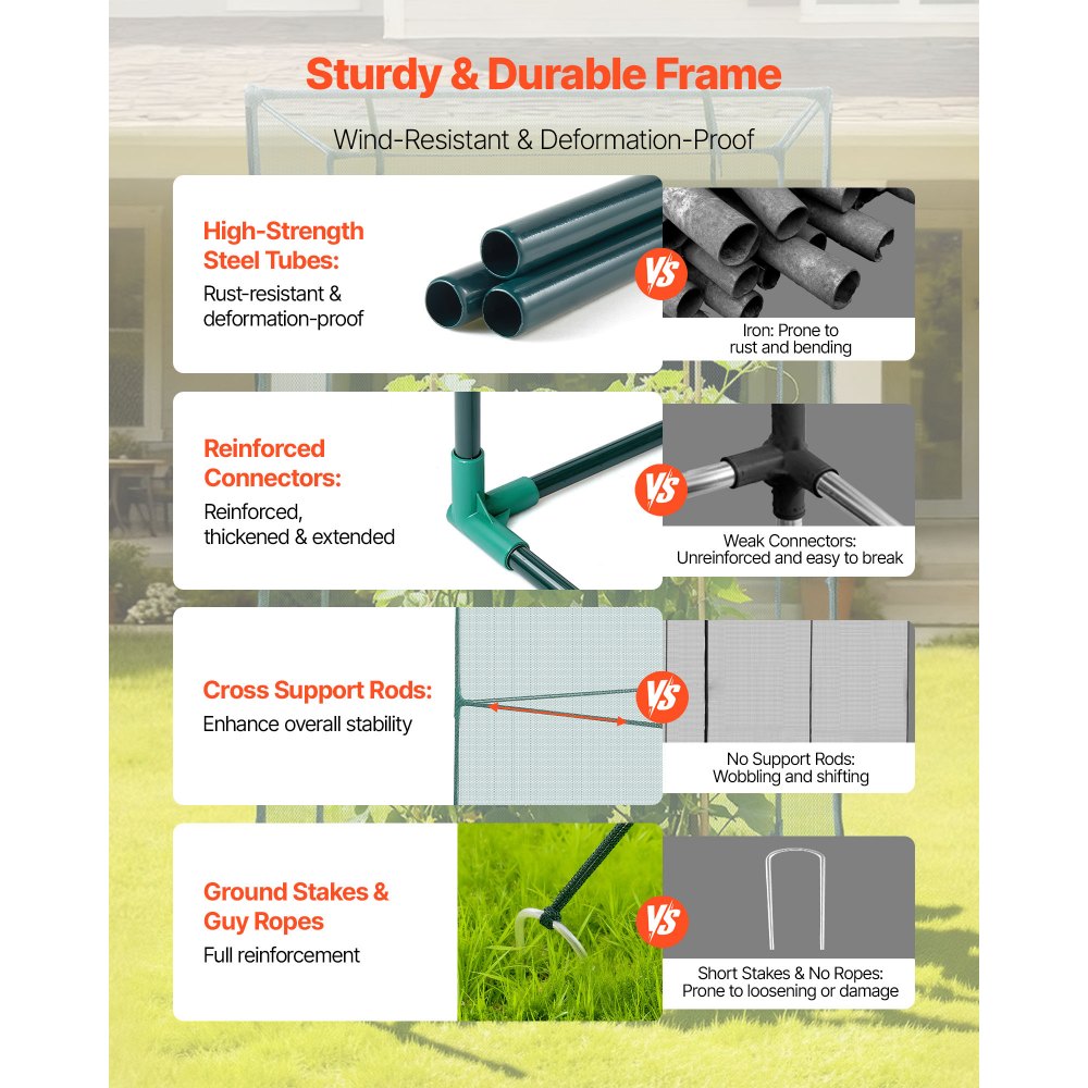 Ευρύχωρο εσωτερικό: Με διαστάσεις 47,24 x 47,24 x 70,87 ίντσες/1200 x 1200 x 1800 χιλιοστά, αυτά τα κλουβιά καλλιεργειών για κήπο παρέχουν άφθονο χώρο για λαχανικά, φρούτα, λουλούδια και άλλα φυτά να ευδοκιμήσουν χωρίς εξωτερικές παρεμβολές. Σταθερή και ανθεκτική στον άνεμο: Κατασκευασμένη από χαλύβδινους σωλήνες με ηλεκτροστατική βαφή πούδρας, η σκηνή προστασίας φυτών μας είναι ανθεκτική στη σκουριά και τη διάβρωση. Οι ενισχυμένες πλαστικές αρθρώσεις και οι πλευρικές ράβδοι στήριξης προσθέτουν σταθερότητα, ενώ οι πάσσαλοι εδάφους σε σχήμα U και τα σχοινιά στήριξης παρέχουν αντοχή στον άνεμο. Αποτελεσματική προστασία: Κατασκευασμένο από ένα πολυεστερικό πλέγμα ανθεκτικό στο σχίσιμο πάχους 0,16 ίντσας/4 χιλιοστών, το κλουβί καλλιέργειας προστατεύει τα φυτά από τα ζώα. Οι οπές αέρα του επιτρέπουν την κυκλοφορία του αέρα, την έκθεση στο ηλιακό φως και τη διείσδυση του νερού, εξασφαλίζοντας επαρκή θρεπτικά συστατικά για την ανάπτυξη των φυτών. Πόρτα με φερμουάρ που τυλίγεται: Η πόρτα με φερμουάρ του κλουβιού των φυτών διαθέτει ενισχυμένες άκρες που παραμένουν ασφαλείς. Απλώς ανοίξτε το φερμουάρ και διπλώστε την κουρτίνα για να μαζέψετε ή να φροντίσετε τα φυτά και στη συνέχεια κλείστε την με φερμουάρ για να σχηματίσετε ένα πλήρως κλειστό φράγμα που κρατά τα ζώα έξω. Εύκολη εγκατάσταση: Με προσεγμένο σχεδιασμό, ο ψηλός κλωβός καλλιέργειας μας είναι εύκολος στην εγκατάσταση χωρίς εργαλεία ή πολύπλοκες εργασίες. Απλώς συναρμολογήστε τους χαλύβδινους σωλήνες με τους συνδετήρες, τοποθετήστε το προστατευτικό πλέγμα και ενισχύστε τους με δοκούς ή πέτρες.