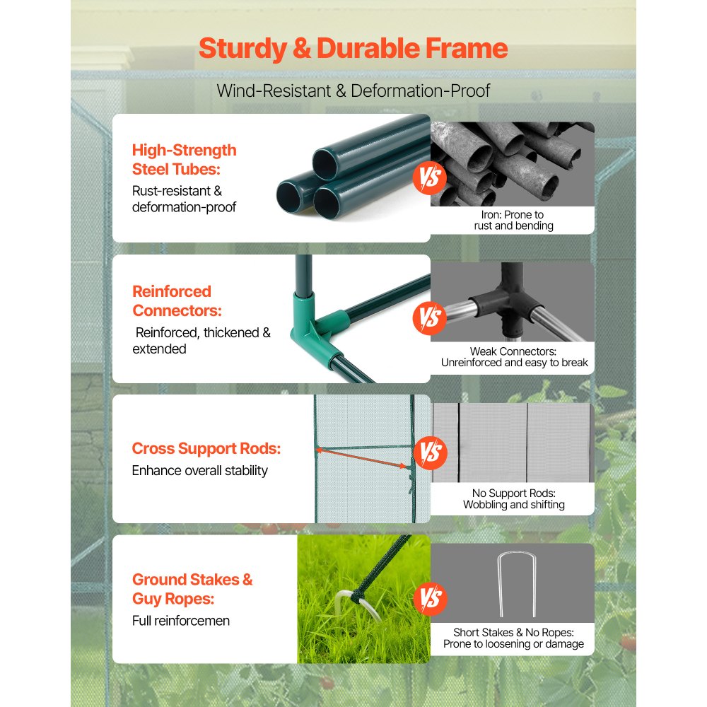 Ευρύχωρο εσωτερικό: Με διαστάσεις 94,33 x 47,24 x 70,87 ίντσες/2396 x 1200 x 1800 χιλιοστά, αυτά τα κλουβιά καλλιεργειών για κήπο παρέχουν άφθονο χώρο για λαχανικά, φρούτα, λουλούδια και άλλα φυτά να ευδοκιμήσουν χωρίς εξωτερικές παρεμβολές. Σταθερή και ανθεκτική στον άνεμο: Κατασκευασμένη από χαλύβδινους σωλήνες με ηλεκτροστατική βαφή πούδρας, η σκηνή προστασίας φυτών μας είναι ανθεκτική στη σκουριά και τη διάβρωση. Οι ενισχυμένες πλαστικές αρθρώσεις και οι πλευρικές ράβδοι στήριξης προσθέτουν σταθερότητα, ενώ οι πάσσαλοι εδάφους σε σχήμα U και τα σχοινιά στήριξης παρέχουν αντοχή στον άνεμο. Αποτελεσματική προστασία: Κατασκευασμένο από ένα πολυεστερικό πλέγμα ανθεκτικό στο σχίσιμο πάχους 0,16 ίντσας/4 χιλιοστών, το κλουβί καλλιέργειας προστατεύει τα φυτά από τα ζώα. Οι οπές αέρα του επιτρέπουν την κυκλοφορία του αέρα, την έκθεση στο ηλιακό φως και τη διείσδυση του νερού, εξασφαλίζοντας επαρκή θρεπτικά συστατικά για την ανάπτυξη των φυτών. Πόρτα με φερμουάρ που τυλίγεται: Η πόρτα με φερμουάρ του κλουβιού των φυτών διαθέτει ενισχυμένες άκρες που παραμένουν ασφαλείς. Απλώς ανοίξτε το φερμουάρ και διπλώστε την κουρτίνα για να μαζέψετε ή να φροντίσετε τα φυτά και στη συνέχεια κλείστε την με φερμουάρ για να σχηματίσετε ένα πλήρως κλειστό φράγμα που κρατά τα ζώα έξω. Εύκολη εγκατάσταση: Με προσεγμένο σχεδιασμό, ο ψηλός κλωβός καλλιέργειας μας είναι εύκολος στην εγκατάσταση χωρίς εργαλεία ή πολύπλοκες εργασίες. Απλώς συναρμολογήστε τους χαλύβδινους σωλήνες με τους συνδετήρες, τοποθετήστε το προστατευτικό πλέγμα και ενισχύστε τους με δοκούς ή πέτρες.