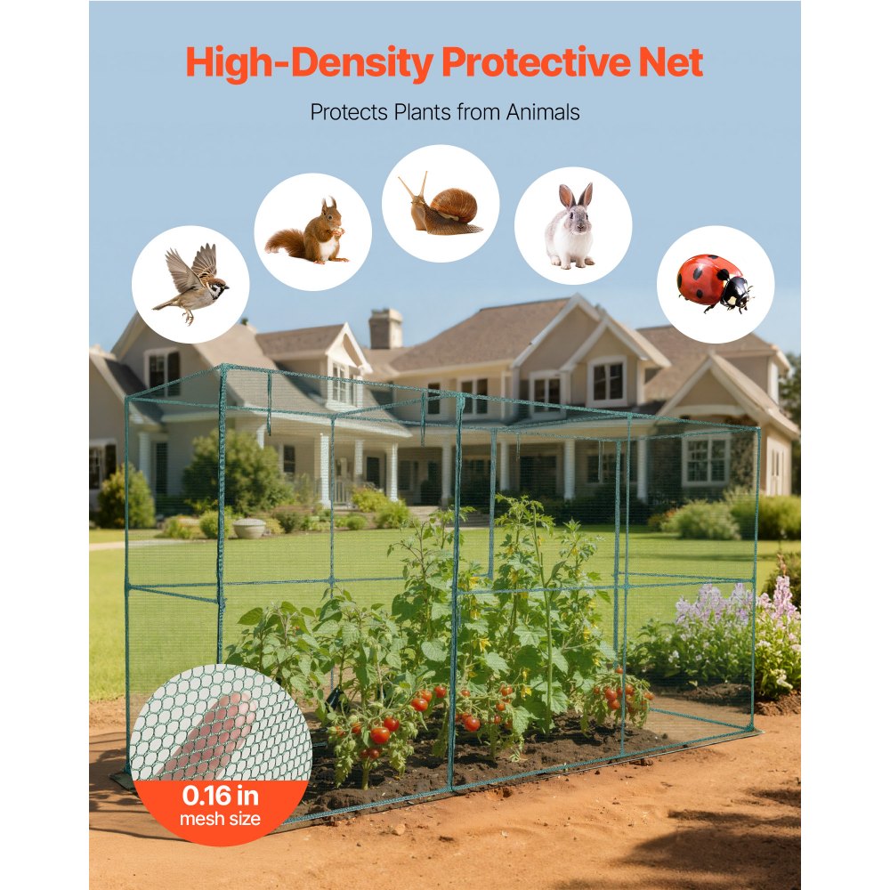 Ευρύχωρο εσωτερικό: Με διαστάσεις 140,16 x 47,24 x 76,38 ίντσες/3560 x 1200 x 1940 χιλιοστά, αυτά τα κλουβιά καλλιεργειών για κήπο παρέχουν άφθονο χώρο για λαχανικά, φρούτα, λουλούδια και άλλα φυτά να ευδοκιμήσουν χωρίς εξωτερικές παρεμβολές. Σταθερή και ανθεκτική στον άνεμο: Κατασκευασμένη από χαλύβδινους σωλήνες με ηλεκτροστατική βαφή πούδρας, η σκηνή προστασίας φυτών μας είναι ανθεκτική στη σκουριά και τη διάβρωση. Οι ενισχυμένες πλαστικές αρθρώσεις και οι πλευρικές ράβδοι στήριξης προσθέτουν σταθερότητα, ενώ οι πάσσαλοι εδάφους σε σχήμα U και τα σχοινιά στήριξης παρέχουν αντοχή στον άνεμο. Αποτελεσματική προστασία: Κατασκευασμένο από ένα πολυεστερικό πλέγμα ανθεκτικό στο σχίσιμο πάχους 0,16 ίντσας/4 χιλιοστών, το κλουβί καλλιέργειας προστατεύει τα φυτά από τα ζώα. Οι οπές αέρα του επιτρέπουν την κυκλοφορία του αέρα, την έκθεση στο ηλιακό φως και τη διείσδυση του νερού, εξασφαλίζοντας επαρκή θρεπτικά συστατικά για την ανάπτυξη των φυτών. Πόρτα με φερμουάρ που τυλίγεται: Η πόρτα με φερμουάρ του κλουβιού των φυτών διαθέτει ενισχυμένες άκρες που παραμένουν ασφαλείς. Απλώς ανοίξτε το φερμουάρ και διπλώστε την κουρτίνα για να μαζέψετε ή να φροντίσετε τα φυτά και στη συνέχεια κλείστε την με φερμουάρ για να σχηματίσετε ένα πλήρως κλειστό φράγμα που κρατά τα ζώα έξω. Εύκολη εγκατάσταση: Με προσεγμένο σχεδιασμό, ο ψηλός κλωβός καλλιέργειας μας είναι εύκολος στην εγκατάσταση χωρίς εργαλεία ή πολύπλοκες εργασίες. Απλώς συναρμολογήστε τους χαλύβδινους σωλήνες με τους συνδετήρες, τοποθετήστε το προστατευτικό πλέγμα και ενισχύστε τους με δοκούς ή πέτρες.