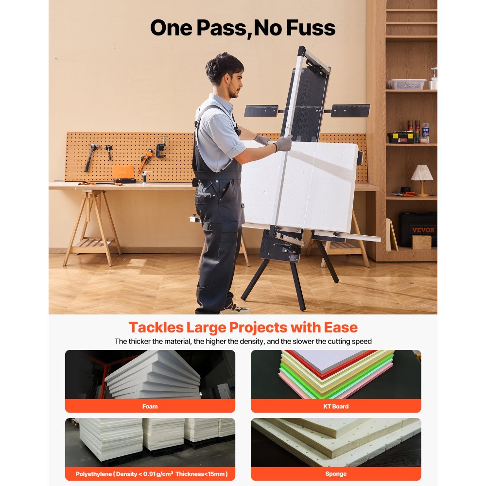 Γρήγορη θέρμανση: Ο κόφτης αφρού θερμού σύρματος VEVOR 200W θερμαίνεται γρήγορα, φτάνοντας στη θερμοκρασία λειτουργίας σε δευτερόλεπτα. Υποστηρίζει μέγιστο μήκος κοπής 1150 mm, μέγιστο πάχος κοπής 410 mm και εύρος κοπής λοξής γωνίας 0–75°, καλύπτοντας μια ποικιλία αναγκών κοπής. Ευέλικτη κοπή: Ο ανεξάρτητος κόφτης φελιζόλ μας υποστηρίζει ευθείες κοπές, επιφανειακές κοπές (κοπές διαχωρισμού), βαθμιδωτές κοπές, κοπές μίτερ, κοπές λοξοτμήσεων και κοπές εσοχής. Είτε εργάζεστε σε καλλιτεχνική μοντελοποίηση, είτε σε κατασκευές DIY είτε σε συσκευασίες, σας βοηθά να διαχειριστείτε κάθε έργο με ευκολία και ακρίβεια. Σύρμα θέρμανσης υψηλής ποιότητας: Εξοπλισμένο με 6 σύρματα θέρμανσης νικελίου-χρωμίου (μήκος 1270 mm, διάμετρος 0,5 mm), αυτός ο ηλεκτρικός κόφτης αφρού προσφέρει αποτελεσματική κοπή για φύλλα αφρού, σανίδες πολυαιθυλενίου (πάχος < 15 mm), σανίδες KT και φύλλα σφουγγαριού. Σημείωση: Όσο πιο παχύ είναι το υλικό, τόσο υψηλότερη είναι η πυκνότητα και τόσο πιο αργή είναι η ταχύτητα κοπής. Εκλεπτυσμένος Σχεδιασμός: Οι ζυγαριές με χάραξη λέιζερ είναι ευκρινείς, ευανάγνωστες και ανθεκτικές στη φθορά και το ξεθώριασμα. Με κινητή ράβδο αλουμινίου, χάρακα κοπής λοξοτμήσεων, εύκαμπτο ρυθμιστικό ορίου και σχεδιασμό με ρουλεμάν, ο κόφτης αφρού θερμού σύρματος επιτρέπει ομαλές, ακριβείς κοπές με ευκολία. Ανθεκτικό και σταθερό: Αυτός ο κόφτης από φελιζόλ με θερμό σύρμα είναι κατασκευασμένος κυρίως από ξύλο και αλουμίνιο, προσφέροντας ανθεκτικότητα ενώ παράλληλα παραμένει ελαφρύς για εύκολη μεταφορά μεταξύ των χώρων εργασίας. Η σταθερή στήριξη με τρία πόδια αποτρέπει αποτελεσματικά την κλίση και την ταλάντωση για πιο ακριβή κοπή.