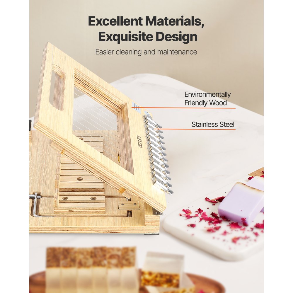 Κόφτης σαπουνιού 2 σε 1: Ο συρμάτινος κόφτης σαπουνιού 2 σε 1 επιτρέπει λειτουργίες κοπής τόσο σε πολλαπλά όσο και σε μονά τμήματα. Ο σχεδιασμός διαίρεσης 12 τμημάτων σάς επιτρέπει να δημιουργείτε 12 ιδανικές μπάρες σαπουνιού πάχους 2,5 εκατοστών με μία κίνηση, καθιστώντας την παρασκευή σαπουνιού πιο αποτελεσματική. Ρυθμιζόμενη τάση σύρματος: Αυτός ο κόφτης σαπουνιού διαθέτει λειτουργία ρυθμιζόμενης τάσης σύρματος, εξασφαλίζοντας τη σταθερότητα και την ανθεκτικότητα του σύρματος κοπής. Πείτε αντίο στο σπάσιμο του σύρματος και ολοκληρώστε την κοπή σαπουνιού χωρίς κόπο, δημιουργώντας ιδανικό τελικό προϊόν. Υλικό ξύλου υψηλής ποιότητας: Κατασκευασμένο από φυσικό ξύλο με όμορφα, φυσικά νερά, αυτό το σαπωνόξυλο είναι πρακτικό και διακοσμητικό. Η λεία ξύλινη επιφάνεια αποτρέπει την ολίσθηση κατά τη χρήση, διευκολύνοντας την κοπή όλων των ειδών σαπουνιού. Βοηθά στη διατήρηση της στεγνότητας του σαπουνιού. Εύκολη κοπή: Τα αιχμηρά μεταλλικά σύρματα κάνουν την κοπή πιο γρήγορη και καθαρότερη. Αυτό σημαίνει ότι μπορείτε να φτιάχνετε αποτελεσματικά σαπούνι ή άλλα χειροποίητα προϊόντα χωρίς ανομοιόμορφες κοπές. Επιπλέον, τα 10 σύρματα που περιλαμβάνονται καλύπτουν τις ανάγκες διαφόρων σαπωνοποιών. Μια ιδανική επιλογή δώρου: Δημιουργήστε μοναδικά, εξατομικευμένα δώρα για την οικογένεια και τους φίλους σας με αυτό το εργαλείο παρασκευής σαπουνιού! Προσθέστε το όνομά τους, επιλέξτε τα αγαπημένα τους χρώματα ή αρώματα και χαρίστε τους μια υπέροχη και αξέχαστη έκπληξη.