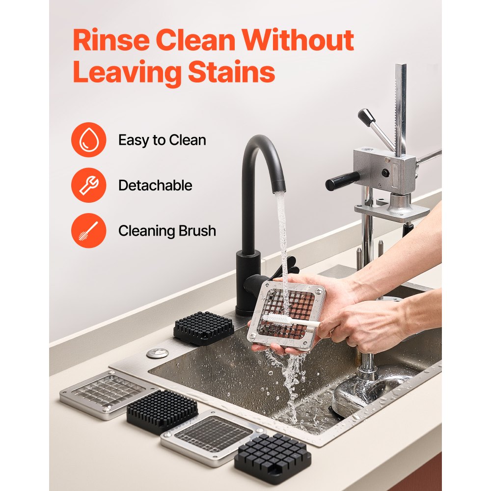 Αναβαθμισμένες λεπίδες: Αυτός ο κόφτης τηγανητών πατατών διαθέτει λεπίδες από ανοξείδωτο ατσάλι 420J2, κατάλληλες για τρόφιμα, σε μεγέθη 1/4", 1/2" και 3/8". Κόβει εύκολα πατάτες, καρότα, αγγούρια και άλλα. Για σκληρά τρόφιμα όπως γλυκοπατάτες, ζεστάνετε πρώτα στον φούρνο μικροκυμάτων για πιο ομαλά κομμάτια. Αποδοτικό και Εξοικονομεί Χρόνο: Η εργονομική, αντιολισθητική λαβή αυτού του κόφτη λαχανικών εξασφαλίζει άνεση και ευκολία. Απλώς πιέστε προς τα κάτω για να κόψετε γρήγορα τα υλικά σας, εξοικονομώντας χρόνο και προσπάθεια. Ιδανικό για εύκολο κόψιμο λαχανικών. Σταθερό και ασφαλές: Η παχιά, αντιολισθητική βάση ενισχύει τη σταθερότητα κατά τη χρήση, αποτρέποντας την ανατροπή του κόφτη πατάτας και εξασφαλίζοντας ομαλότερη λειτουργία. Προστατεύει επίσης τον πάγκο σας από γρατζουνιές και ζημιές. Εύκολος καθαρισμός: Κατασκευασμένος από ανθεκτικό ανοξείδωτο ατσάλι και κράμα αλουμινίου, αυτός ο κόφτης λαχανικών είναι ανθεκτικός στη διάβρωση. Οι λεπίδες από ανοξείδωτο ατσάλι είναι αποσπώμενες για εύκολο καθάρισμα με την παρεχόμενη βούρτσα, παρατείνοντας τη διάρκεια ζωής του κόφτη. Ευέλικτη χρήση: Ο χειροκίνητος κόφτης πατάτας είναι ιδανικός για εστιατόρια, ζαχαροπλαστεία και οικιακές κουζίνες. Ιδανικός για την προετοιμασία λαχανικών και φρούτων για σαλάτες, πατάτες τηγανητές και επιδόρπια, είναι μια πρωτοποριακή λύση για τη μείωση του χρόνου προετοιμασίας και την ενίσχυση της αποδοτικότητας.