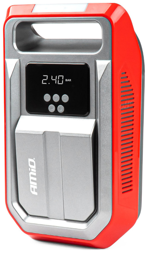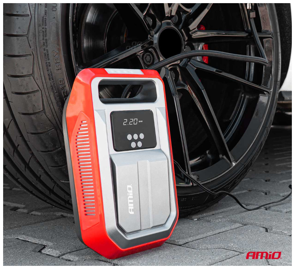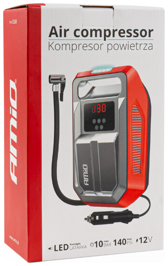Κομπρεσέρ αέρα ελαστικών με φις αναπτήρα και led φακό και οθόνη LCD, από την εταιρεία ΑMiO, πολωνικής προέλευσης.