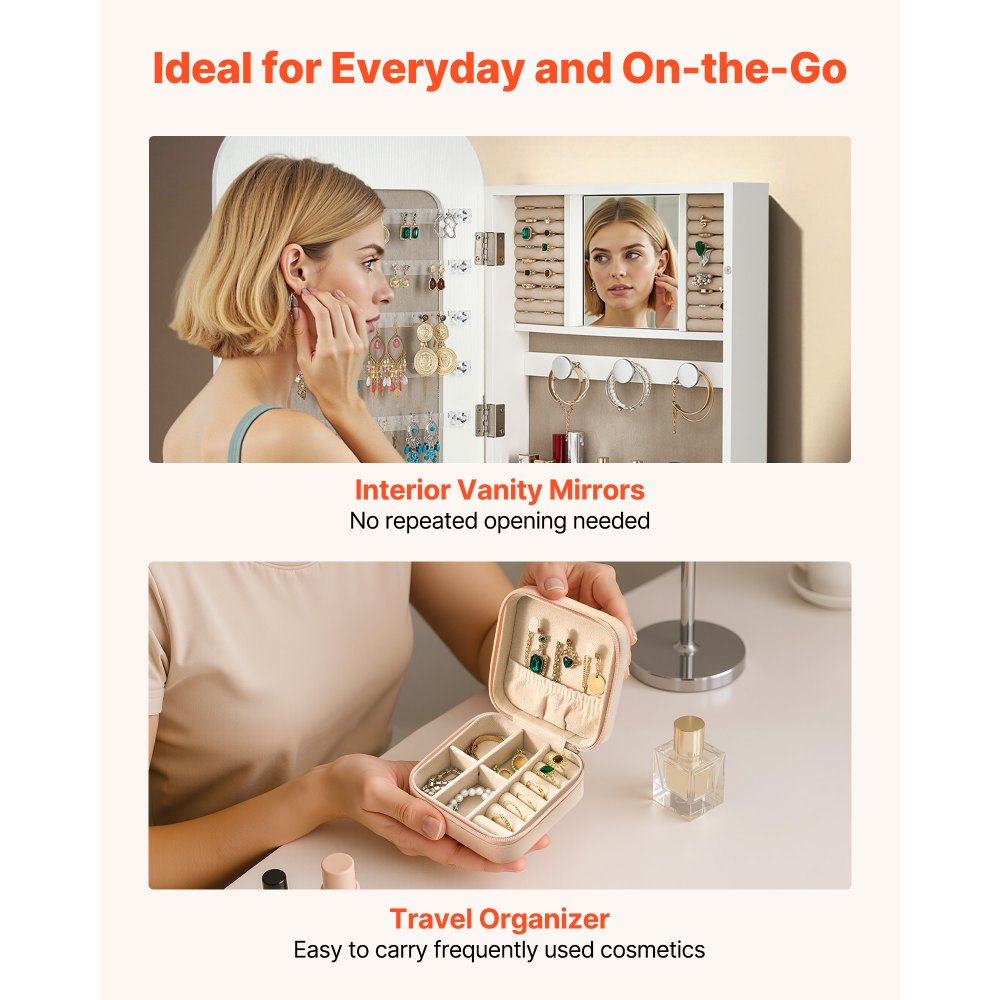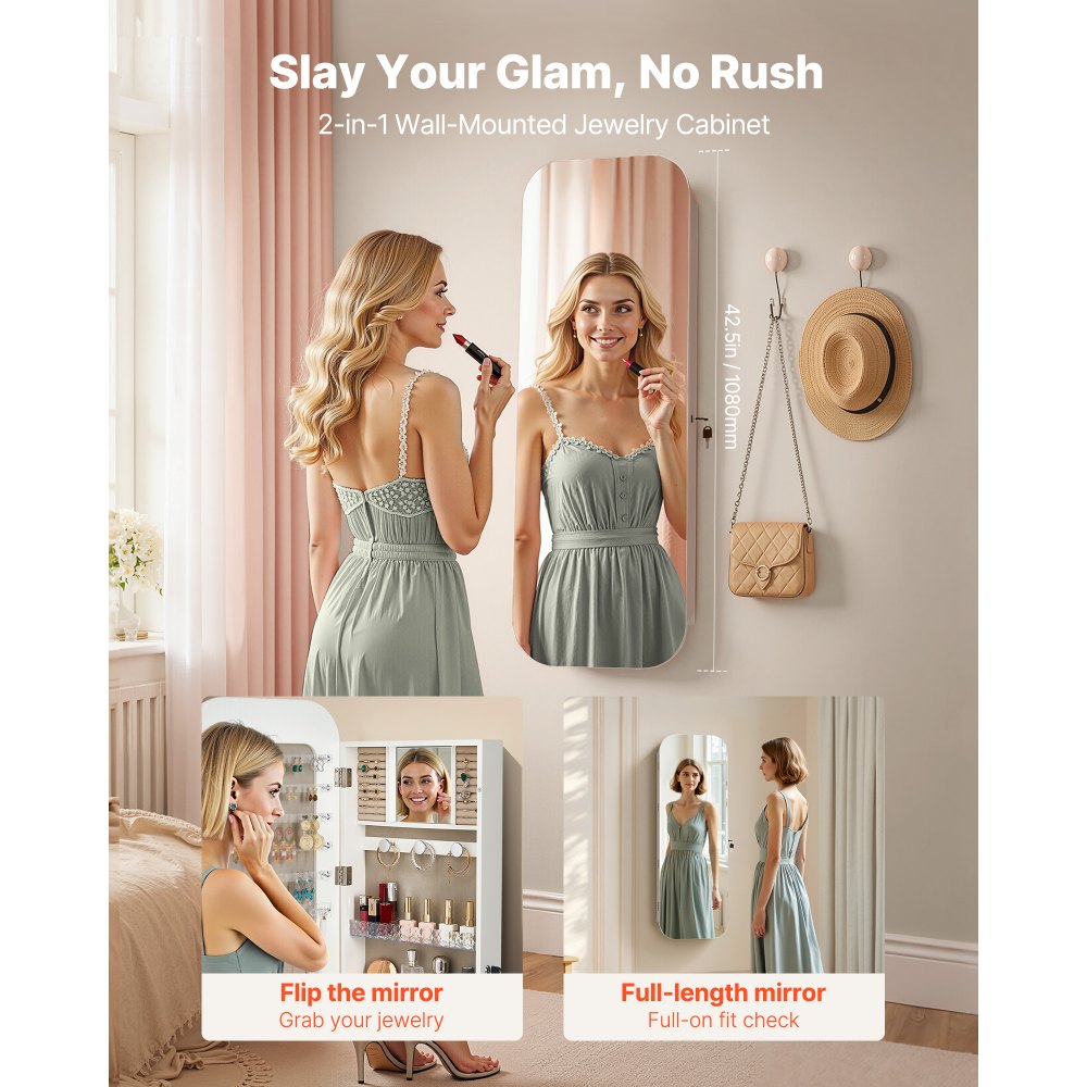 Ευρύχωρα διαμερίσματα: Η θήκη κοσμημάτων με καθρέφτη μπορεί να χωρέσει 90 σκουλαρίκια, 30 καρφιά, 20 κολιέ, 45 δαχτυλίδια, 3 θήκες για βραχιόλια σε σχήμα μανιταριού, 4 ράφια για καλλυντικά, καθώς και εσωτερικές θήκες για μάσκες ή βαμβάκι - διατηρήστε τα κοσμήματά σας οργανωμένα και εύκολα στην εύρεση. Καθρέφτης πλήρους μήκους & Κρυφός χώρος αποθήκευσης: Δεν είναι απλώς μια θήκη κοσμημάτων—ο καθρέφτης με χώρο αποθήκευσης είναι επίσης ένας καθρέφτης πλήρους μήκους με καθαρή αντανάκλαση χωρίς παραμόρφωση. Γρήγορη πρόσβαση σε μακιγιάζ και αξεσουάρ, έλεγχος της εμφάνισής σας και ετοιμαστείτε με σιγουριά. Υλικά υψηλής ποιότητας: Κατασκευασμένος από επεξεργασμένο χαρτόνι 44,9 lb/ft³, αυτός ο καθρέφτης κοσμημάτων είναι ανθεκτικός, ανθεκτικός στις γρατσουνιές και τη φθορά και διατηρεί μακροχρόνια σταθερότητα. Η απαλή, βελούδινη επένδυση προστατεύει τα κοσμήματα και ο γυάλινος καθρέφτης υψηλής ποιότητας καθαρίζεται καθαρά για να λάμπει σαν καινούργιος. Ευέλικτη τοποθέτηση και ασφάλεια: Κρεμάστε το σε ένα πλαίσιο πόρτας ή στερεώστε το σε έναν συμπαγή τοίχο χρησιμοποιώντας τα παρεχόμενα εξαρτήματα. Αυτός ο καθρέφτης με χώρο αποθήκευσης κοσμημάτων διαθέτει 2 κλειδιά για να κλειδώνετε τα τιμαλφή, διατηρώντας τα κοσμήματα ασφαλή, εξοικονομώντας παράλληλα χώρο στο δάπεδο. Εύκολη συναρμολόγηση με σαφείς οδηγίες. Ιδανική επιλογή δώρου: Ο κομψός καμπυλωτός σχεδιασμός του καθρέφτη αποθήκευσης αποτελεί ένα κομψό, προσεγμένο δώρο για τη σύζυγό σας, τη μητέρα σας, την κοπέλα σας ή τους φίλους σας. Ιδανικό για γενέθλια, γάμους, επετείους, Χριστούγεννα, Ημέρα των Ευχαριστιών ή οποιαδήποτε ειδική περίσταση.