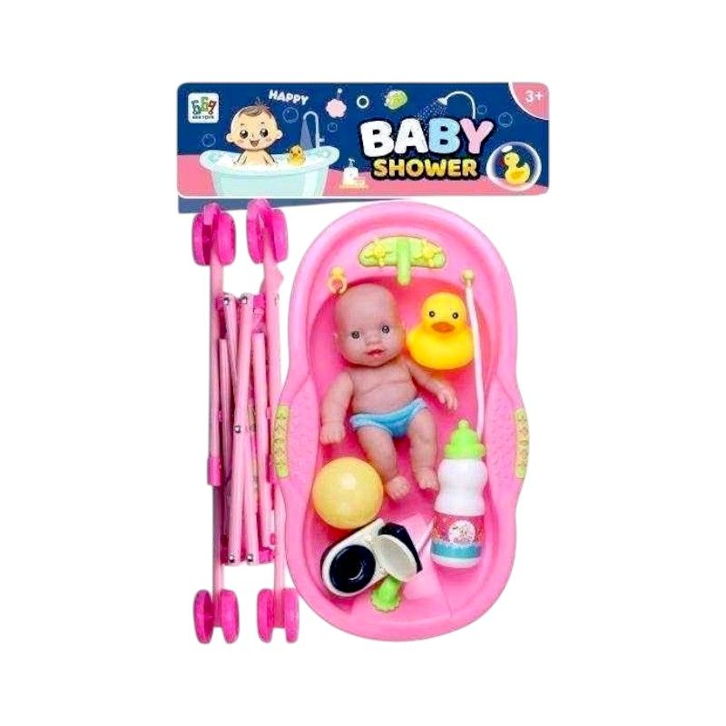 Σετ κούκλα με καροτσάκι βόλτας και πλήρες σετ μπάνιου με μπανιέρα και παιχνίδια, σε πανέμορφο πολύχρωμο σχεδιασμό με πολλαπλές δυνατότητες και με ανθεκτική κατασκευή για ατελείωτο παιχνίδι!