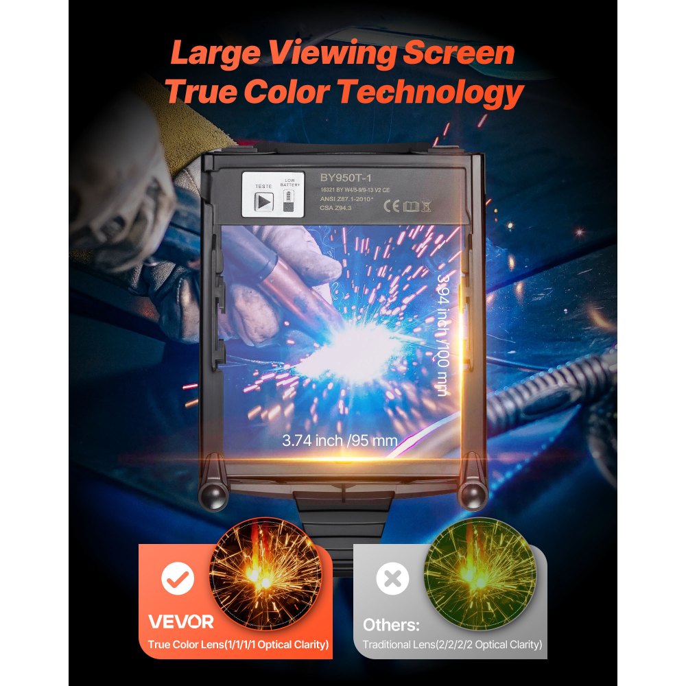 Μεγάλη & Πραγματική Έγχρωμη Θέαση: Με μεγάλη οθόνη προβολής 3,94" x 3,74" (100 x 95 mm), αναβαθμισμένη τεχνολογία πραγματικών χρωμάτων και οπτική καθαρότητα 1/1/1/1, το κράνος συγκόλλησης VEVOR σας προσφέρει καθαρή, ευκρινή, φυσική θέα για ασφαλέστερη και ακριβέστερη συγκόλληση. Αυτόματη σκίαση σε χιλιοστά του δευτερολέπτου: Εξοπλισμένη με 4 έξυπνους αισθητήρες τόξου, η κουκούλα συγκόλλησης σκουραίνει αυτόματα σε μόλις 1/20000 δευτερόλεπτα, φιλτράροντας το επιβλαβές και έντονο φως, μειώνοντας την αντανάκλαση του τόξου, ενισχύοντας την οπτική καθαρότητα και την προστασία των ματιών. Ρυθμιζόμενο εύρος απόχρωσης: Η μάσκα συγκόλλησης πραγματικού χρώματος διαθέτει ρυθμιζόμενα επίπεδα απόχρωσης DIN—DIN 4 (Λειτουργία λείανσης), DIN 5–9 (Λειτουργία κοπής) και DIN 9–13 (Λειτουργία συγκόλλησης). Εύκολη εναλλαγή μεταξύ τρόπων λειτουργίας για βελτίωση της αποδοτικότητας και της ασφάλειας. Ηλιακή φόρτιση: Αυτό το κράνος συγκόλλησης με αυτόματη σκίαση διαθέτει 2 μπαταρίες λιθίου και υποστηρίζει ηλιακή φόρτιση, εξαλείφοντας την ανάγκη για συχνές αντικαταστάσεις μπαταριών. Η σταθερή τροφοδοσία εξασφαλίζει συνεπή και μακράς διαρκείας απόδοση. Τέλεια εφαρμογή: Διαθέτοντας ρυθμιζόμενο επάνω λουράκι, μαζί με κουμπιά ρύθμισης πλάτους και γωνίας, αυτό το κράνος συγκόλλησης προσφέρει εξατομικευμένη εφαρμογή και άνεση. Κατασκευασμένο από υλικά ανθεκτικά στη θερμότητα και τις κρούσεις, μπλοκάρει αποτελεσματικά τους σπινθήρες που εκτοξεύονται για να προστατεύει το πρόσωπο και τα μάτια σας.