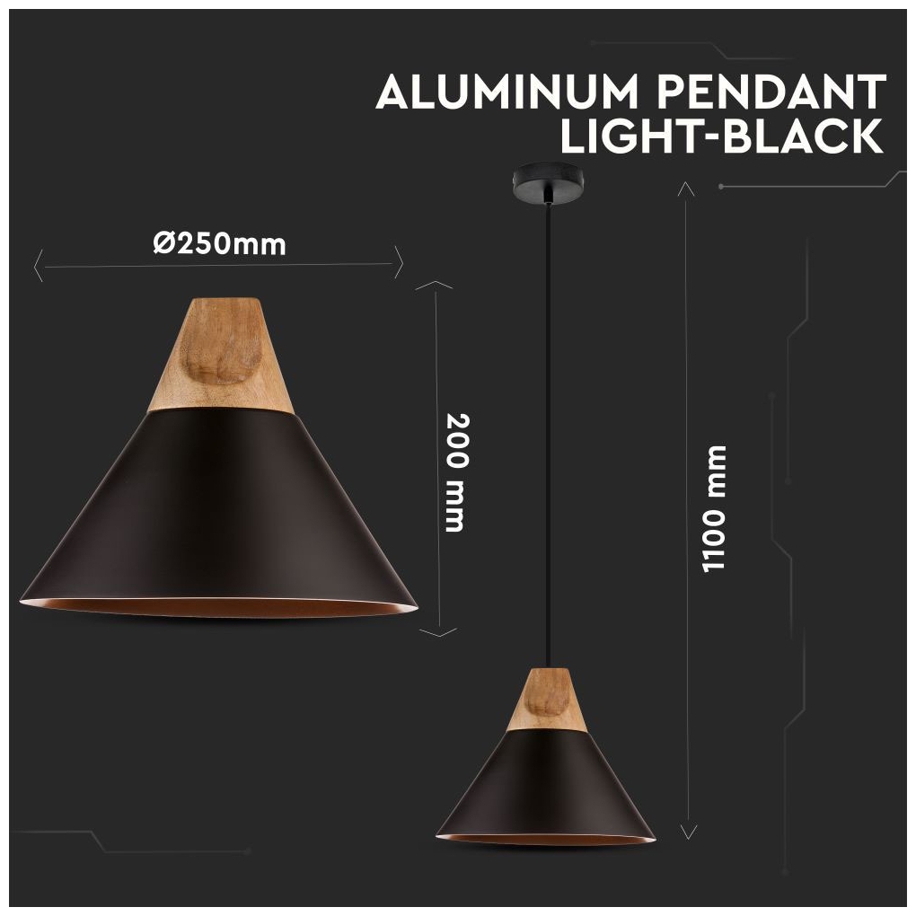 Κρεμαστό Φωτιστικό V-TAC Καπέλο Κώνος Αλουμίνιο Μαύρο με Ξύλινη Βάση και ντουί Ε27 Φ260mm 3757