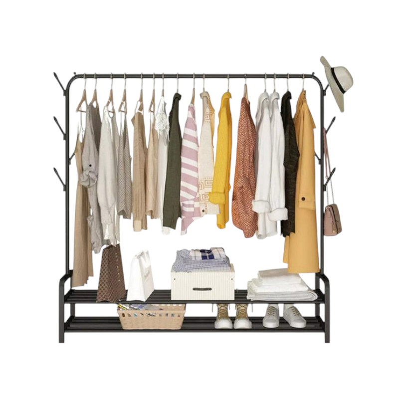 Kρεμάστρα δαπέδου μονή, μεταλλική, με 2 ράφια παπουτσιών και πλαϊνές κρεμάστρες, ιδανική ως έπιπλο εισόδου ή για την οργάνωση των ρούχων στο δωμάτιό σας.