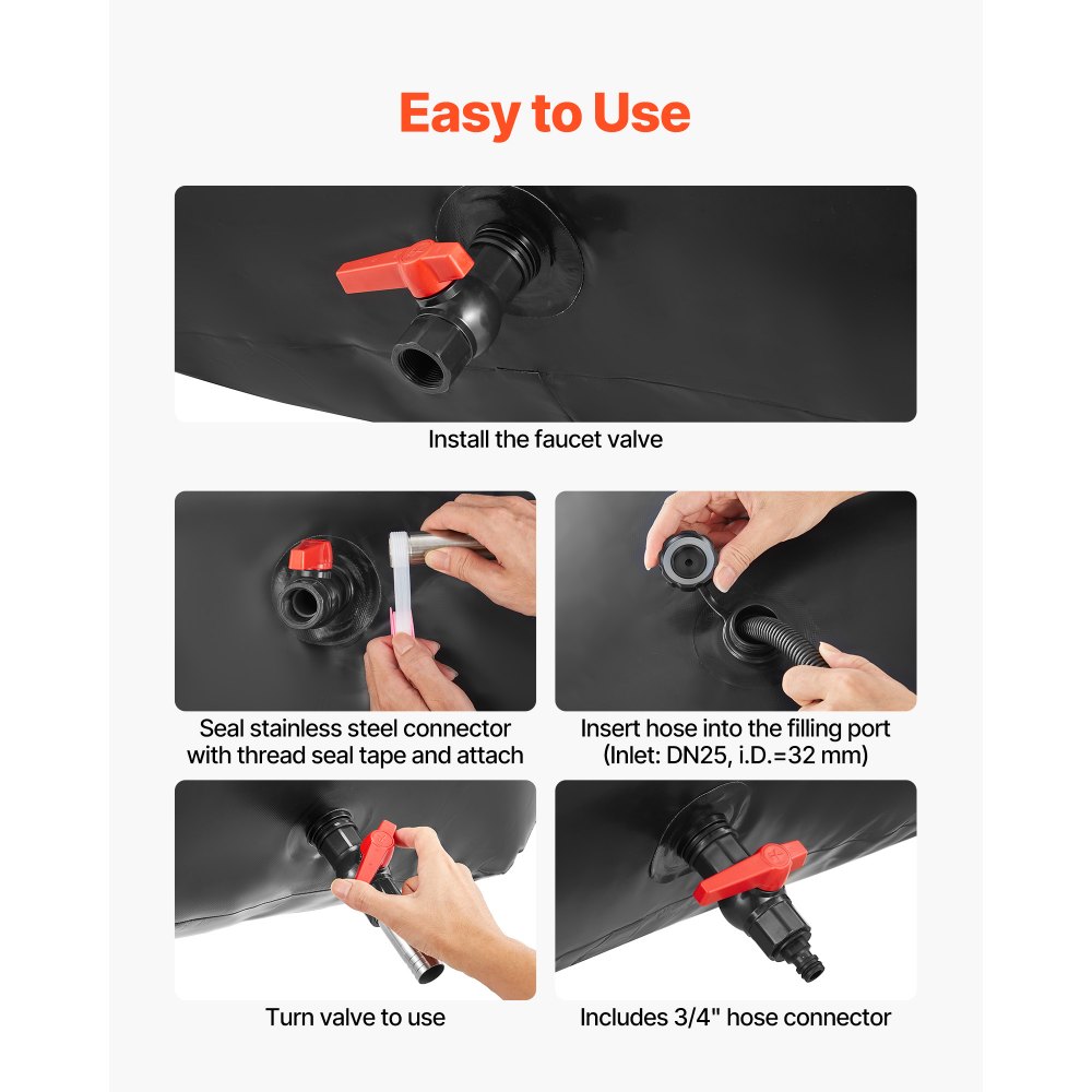 Τσάντα αποθήκευσης νερού 63,4 γαλονιών: Η τσάντα αποθήκευσης νερού από PVC έχει διαστάσεις 39,8 x 23,6 x 17,7 ίντσες, και χωράει έως και 240 λίτρα / 63,4 γαλόνια—ιδανική για άρδευση, παροχή νερού για τροχόσπιτα ή αποθήκευση νερού έκτακτης ανάγκης. Συνοδεύεται από ένα πλήρες κιτ αξεσουάρ και ένα κιτ επισκευής για εύκολη χρήση. PVC διπλής στρώσης 1000D: Κατασκευασμένο από παχύ διπλό ύφασμα 1000D με επίστρωση PVC, ενισχυμένο με εσωτερικό στρώμα πλέγματος ανθεκτικό στη φθορά και το σχίσιμο, αυτή η σακούλα αποθήκευσης νερού αντέχει σε θερμοκρασίες από 5°F έως 167°F. Αυτή η δομή μειώνει τη γήρανση και παρατείνει τη διάρκεια ζωής της σακούλας. Αναβαθμισμένη Σφράγιση: Η θερμοκόλληση υψηλής θερμοκρασίας ενισχύει τις διπλές ραφές PVC. Οι διπλές θερμοκολλημένες θύρες αντιστέκονται στο σκίσιμο και ενισχύουν την αντοχή στην πίεση. Οι προεγκατεστημένοι δακτύλιοι στεγανοποίησης στην έξοδο (συν ένας επιπλέον δακτύλιος αντικατάστασης) και η ταινία στεγανοποίησης που περιλαμβάνονται εξασφαλίζουν μια σταθερή, χωρίς διαρροές σύνδεση με τη βρύση/σύνδεσμο. Εύκολη χρήση: Η πτυσσόμενη σακούλα αποθήκευσης νερού διαθέτει προεγκατεστημένα εξαρτήματα εισόδου (DN25, αρσενικό σπείρωμα 32 mm) και εξόδου (DN20, αρσενικό σπείρωμα 25 mm). Απλώς συνδέστε τη βρύση στην έξοδο και έναν εύκαμπτο σωλήνα κήπου για να γεμίσετε. Έτοιμη για χρήση σε λίγα λεπτά. Φορητό & Εύκολο στην αποθήκευση: Η φορητή θήκη νερού διαθέτει τέσσερις ενισχυμένους βρόχους μεταφοράς που επιτρέπουν την ασφαλή τοποθέτηση σε καρότσες pickup, SUV ή στην οροφή για ασφαλή μεταφορά. Το εύκαμπτο υλικό PVC διπλώνει επίπεδα για συμπαγή αποθήκευση όταν δεν χρησιμοποιείται, εξαλείφοντας την ανάγκη για ογκώδεις δεξαμενές νερού.