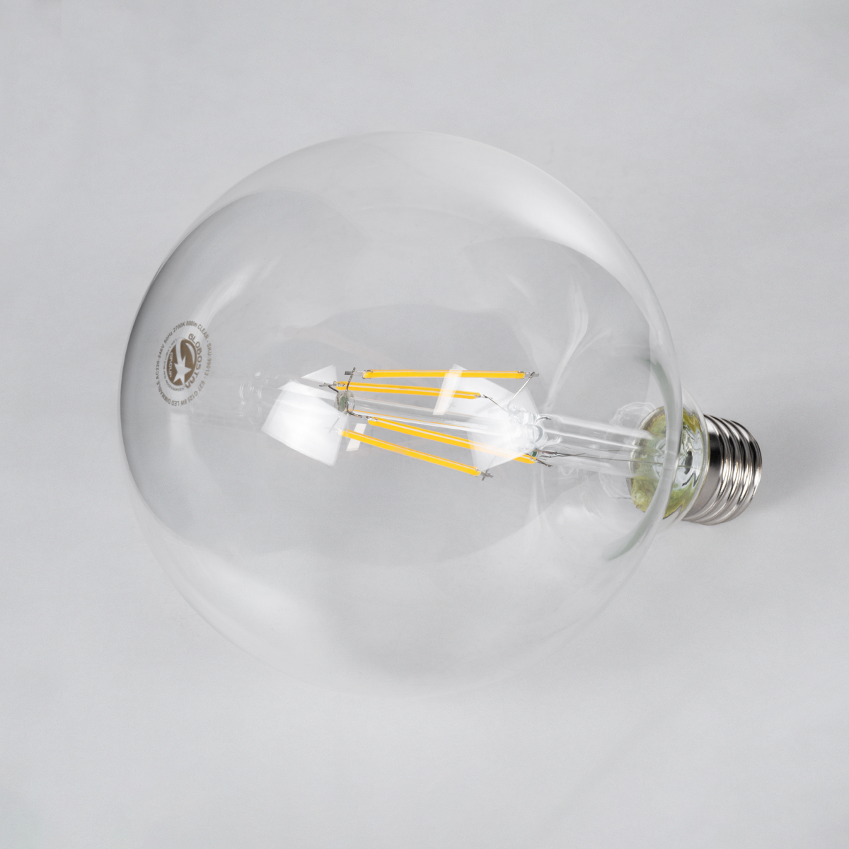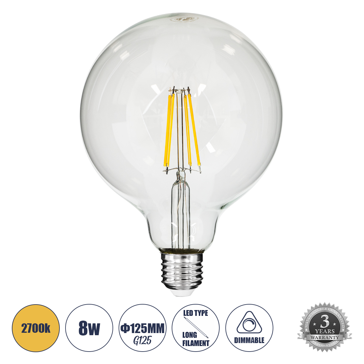 GLOBOSTAR® BUBBLE 99013 Λάμπα E27 G125 LED 8W 800lm 360° AC 220-240V IP20 Θερμό Λευκό 2700K Dimmable - Long Filament Chip - Διάφανο - Μ12.5 x Π12.5 x Υ18cm - 3 Χρόνια Εγγύηση