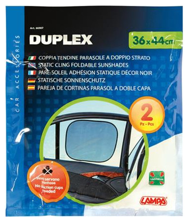 Κουρτινάκια για τα πλαϊνά παράθυρα του αυτοκινήτου με ειδική εσωτερική επένδυση PVC υλικού, το οποίο μόλις ακουμπήσει στο παράθυρο δημιουργεί στατικό ηλεκτρισμό ανάμεσα στο κουρτινάκι και το τζάμι, ο οποίος συγκρατεί σταθερό το προϊόν χωρίς την απαραίτητη χρήση πρόσθετου εξοπλισμού, όπως βεντούζες, κτλ. Τα κουρτινάκια προστατεύουν τους επιβάτες από τις επιβλαβείς ακτίνες του ηλίου, απορροφούν το μεγαλύτερο μέρος της ζέστης, η ηλιακή θερμότητα στο σαλόνι του οχήματος μειώνεται σημαντικά με αποτέλεσμα να καίγεται παράλληλα και λιγότερο καύσιμο, μιας και η ρύθμιση της εσωτερικής θερμοκρασίας του οχήματος βοηθά στην καλύτερη απόδοση του κλιματιστικού. Δεν εμποδίζει την ορατότητα των επιβατών μέσα από το όχημα. Αναδιπλώνουν πλήρως για εύκολη αποθήκευση και μεταφορά. Τοποθετούνται εύκολα και γρήγορα.