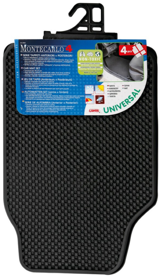 Πατάκια λάστιχο Montecarlo-4, κατασκευασμένα από άοσμο, οικολογικό λάστιχο, φιλικό προς το περιβάλλον με βάση από 100% συνθετικό ανακυκλώσιμο υλικό, ιταλικής προέλευσης από την εταιρία Lampa. Ιδανικά πατάκια για προστασία δαπέδου της εσωτερικής καμπίνας του οχήματός σας από νερό, λάσπη, σκόνη κ.α ή για να προστατεύσετε τις ήδη υπάρχουσες μοκέτες από την τριβή του παπουτσιού, βάζοντας τα πατάκια λάστιχο Montecarlo από πάνω. Είναι αντιολισθητικά στην πίσω πλευρά τους για καλύτερη σταθερότητα κατά την εφαρμογή. Κατάλληλα για την τοποθέτησή τους στα περισσότερα αυτοκίνητα.