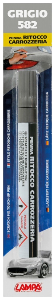 Στυλό επισκευής γρατζουνιών SCRATCH FIX TOUCH-UP PENS από τη εταιρία LAMPA, ιταλικής προέλευσης, σε γκρι χρώμα με κωδικό χρώματος 582, κατάλληλο για το "γέμισμα" των γρατζουνιών (φθορών/εκδορών), ώστε κατόπιν εφαρμογής να υπάρχει ένα ενιαίο φινίρισμα στην επιφάνεια του οχήματος. Το χρώμα του στυλό είναι απόλυτα ταιριαστό με το εργοστασιακό χρώμα του αυτοκινήτου και ο αριθμός του κωδικού (582) ταυτίζεται πλήρως με τον αριθμό που αναγράφεται πάνω στο αμάξωμα του εκάστοτε οχήματος (βλ. πίνακα εφαρμογών και επιλογής χρώματος).